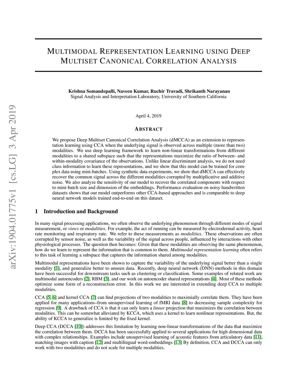 We propose Deep Multiset Canonical Correlation Analysis (dMCCA) as an extension to representation learning using CCA when the underlying signal is observed across multiple (more than two) modalities. We use deep learning framework to learn non-linear transformations from different modalities to a shared subspace such that the representations maximize the ratio of between- and within-modality covariance of the observations. Unlike linear discriminant analysis, we do not need class information to learn these representations, and we show that this model can be trained for complex data using mini-batches. Using synthetic data experiments, we show that dMCCA can effectively recover the common signal across the different modalities corrupted by multiplicative and additive noise. We also analyze the sensitivity of our model to recover the correlated components with respect to mini-batch size and dimension of the embeddings. Performance evaluation on noisy handwritten datasets shows that our model outperforms other CCA-based approaches and is comparable to deep neural network models trained end-to-end on this dataset.