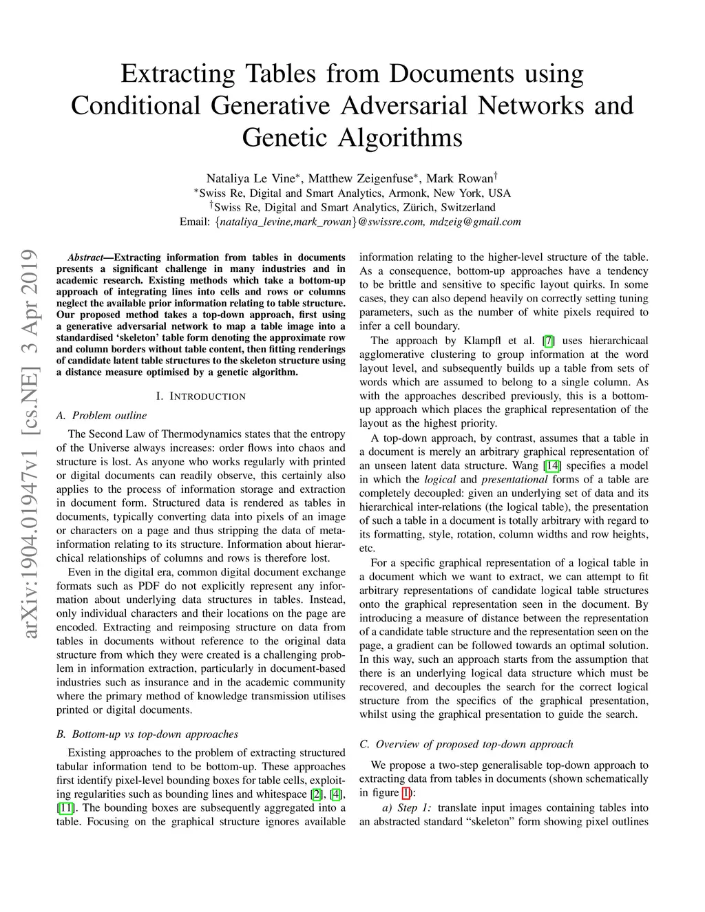 Extracting information from tables in documents presents a significant challenge in many industries and in academic research. Existing methods which take a bottom-up approach of integrating lines into cells and rows or columns neglect the available prior information relating to table structure. Our proposed method takes a top-down approach, first using a generative adversarial network to map a table image into a standardised `skeleton' table form denoting the approximate row and column borders without table content, then fitting renderings of candidate latent table structures to the skeleton structure using a distance measure optimised by a genetic algorithm.