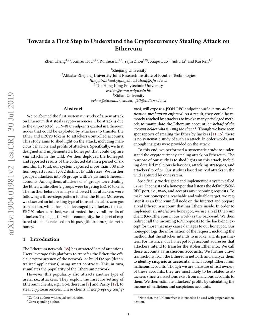 We performed the first systematic study of a new attack on Ethereum that steals cryptocurrencies. The attack is due to the unprotected JSON-RPC endpoints existed in Ethereum nodes that could be exploited by attackers to transfer the Ether and ERC20 tokens to attackers-controlled accounts. This study aims to shed light on the attack, including malicious behaviors and profits of attackers. Specifically, we first designed and implemented a honeypot that could capture real attacks in the wild. We then deployed the honeypot and reported results of the collected data in a period of six months. In total, our system captured more than 308 million requests from 1,072 distinct IP addresses. We further grouped attackers into 36 groups with 59 distinct Ethereum accounts. Among them, attackers of 34 groups were stealing the Ether, while other 2 groups were targeting ERC20 tokens. The further behavior analysis showed that attackers were following a three-steps pattern to steal the Ether. Moreover, we observed an interesting type of transaction called zero gas transaction, which has been leveraged by attackers to steal ERC20 tokens. At last, we estimated the overall profits of attackers. To engage the whole community, the dataset of captured attacks is released on https://github.com/zjuicsr/eth-honey.