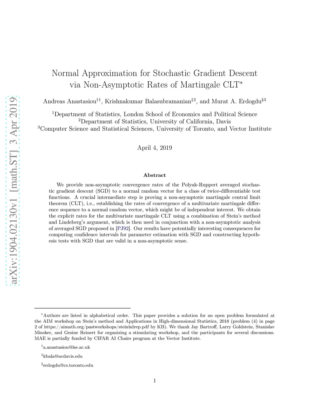 We provide non-asymptotic convergence rates of the Polyak-Ruppert averaged stochastic gradient descent (SGD) to a normal random vector for a class of twice-differentiable test functions. A crucial intermediate step is proving a non-asymptotic martingale central limit theorem (CLT), i.e., establishing the rates of convergence of a multivariate martingale difference sequence to a normal random vector, which might be of independent interest. We obtain the explicit rates for the multivariate martingale CLT using a combination of Stein's method and Lindeberg's argument, which is then used in conjunction with a non-asymptotic analysis of averaged SGD proposed in [PJ92]. Our results have potentially interesting consequences for computing confidence intervals for parameter estimation with SGD and constructing hypothesis tests with SGD that are valid in a non-asymptotic sense.