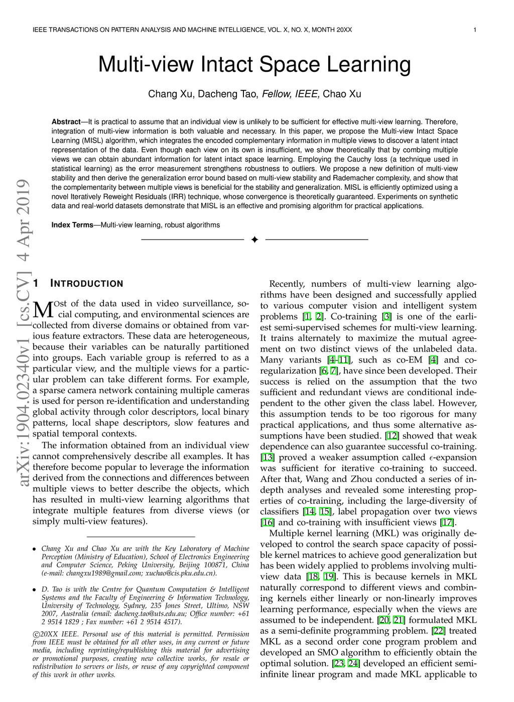 It is practical to assume that an individual view is unlikely to be sufficient for effective multi-view learning. Therefore, integration of multi-view information is both valuable and necessary. In this paper, we propose the Multi-view Intact Space Learning (MISL) algorithm, which integrates the encoded complementary information in multiple views to discover a latent intact representation of the data. Even though each view on its own is insufficient, we show theoretically that by combing multiple views we can obtain abundant information for latent intact space learning. Employing the Cauchy loss (a technique used in statistical learning) as the error measurement strengthens robustness to outliers. We propose a new definition of multi-view stability and then derive the generalization error bound based on multi-view stability and Rademacher complexity, and show that the complementarity between multiple views is beneficial for the stability and generalization. MISL is efficiently optimized using a novel Iteratively Reweight Residuals (IRR) technique, whose convergence is theoretically analyzed. Experiments on synthetic data and real-world datasets demonstrate that MISL is an effective and promising algorithm for practical applications.