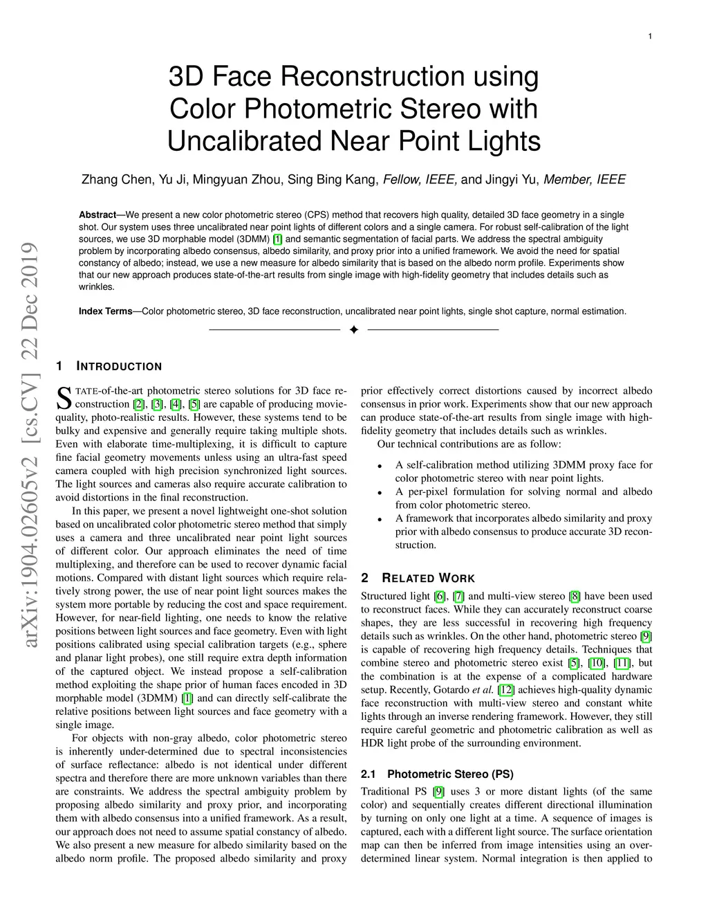 We present a new color photometric stereo (CPS) method that recovers high quality, detailed 3D face geometry in a single shot. Our system uses three uncalibrated near point lights of different colors and a single camera. For robust self-calibration of the light sources, we use 3D morphable model (3DMM) and semantic segmentation of facial parts. We address the spectral ambiguity problem by incorporating albedo consensus, albedo similarity, and proxy prior into a unified framework. We avoid the need for spatial constancy of albedo; instead, we use a new measure for albedo similarity that is based on the albedo norm profile. Experiments show that our new approach produces state-of-the-art results from single image with high-fidelity geometry that includes details such as wrinkles.