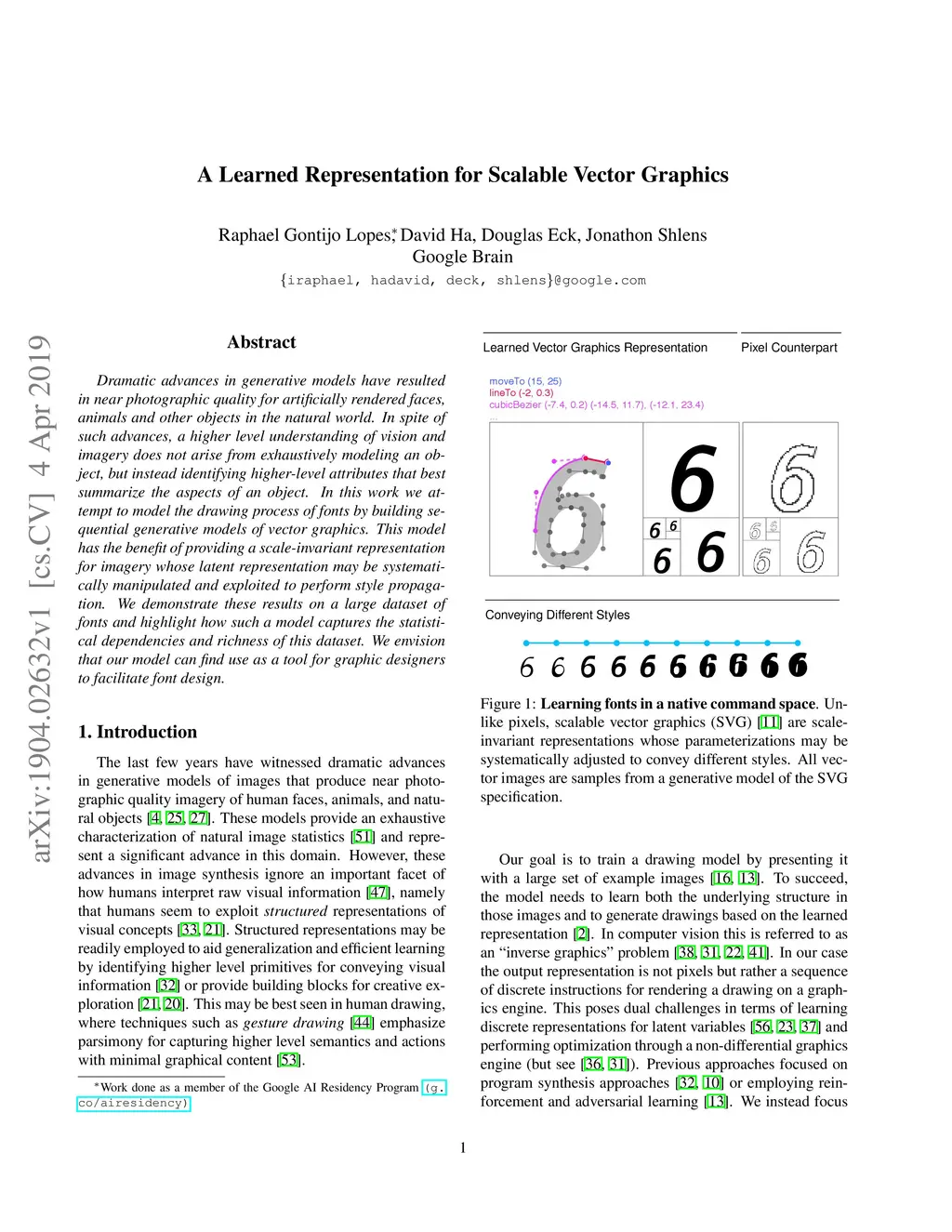 Dramatic advances in generative models have resulted in near photographic quality for artificially rendered faces, animals and other objects in the natural world. In spite of such advances, a higher level understanding of vision and imagery does not arise from exhaustively modeling an object, but instead identifying higher-level attributes that best summarize the aspects of an object. In this work we attempt to model the drawing process of fonts by building sequential generative models of vector graphics. This model has the benefit of providing a scale-invariant representation for imagery whose latent representation may be systematically manipulated and exploited to perform style propagation. We demonstrate these results on a large dataset of fonts and highlight how such a model captures the statistical dependencies and richness of this dataset. We envision that our model can find use as a tool for graphic designers to facilitate font design.