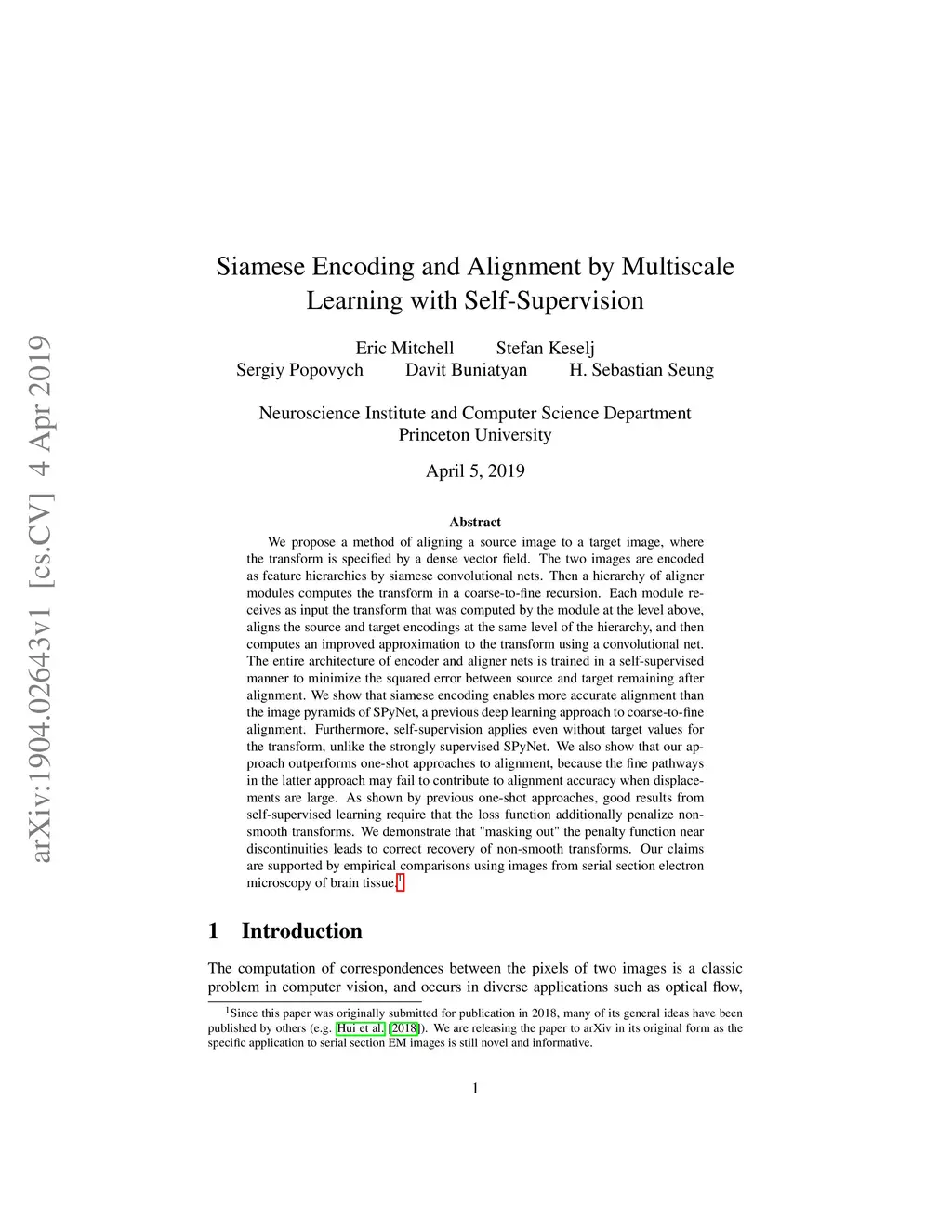 We propose a method of aligning a source image to a target image, where the transform is specified by a dense vector field. The two images are encoded as feature hierarchies by siamese convolutional nets. Then a hierarchy of aligner modules computes the transform in a coarse-to-fine recursion. Each module receives as input the transform that was computed by the module at the level above, aligns the source and target encodings at the same level of the hierarchy, and then computes an improved approximation to the transform using a convolutional net. The entire architecture of encoder and aligner nets is trained in a self-supervised manner to minimize the squared error between source and target remaining after alignment. We show that siamese encoding enables more accurate alignment than the image pyramids of SPyNet, a previous deep learning approach to coarse-to-fine alignment. Furthermore, self-supervision applies even without target values for the transform, unlike the strongly supervised SPyNet. We also show that our approach outperforms one-shot approaches to alignment, because the fine pathways in the latter approach may fail to contribute to alignment accuracy when displacements are large. As shown by previous one-shot approaches, good results from self-supervised learning require that the loss function additionally penalize non-smooth transforms. We demonstrate that "masking out" the penalty function near discontinuities leads to correct recovery of non-smooth transforms. Our claims are supported by empirical comparisons using images from serial section electron microscopy of brain tissue.