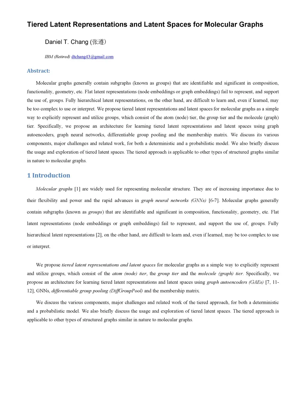 Molecular graphs generally contain subgraphs (known as groups) that are identifiable and significant in composition, functionality, geometry, etc. Flat latent representations (node embeddings or graph embeddings) fail to represent, and support the use of, groups. Fully hierarchical latent representations, on the other hand, are difficult to learn and, even if learned, may be too complex to use or interpret. We propose tiered latent representations and latent spaces for molecular graphs as a simple way to explicitly represent and utilize groups, which consist of the atom (node) tier, the group tier and the molecule (graph) tier. Specifically, we propose an architecture for learning tiered latent representations and latent spaces using graph autoencoders, graph neural networks, differentiable group pooling and the membership matrix. We discuss its various components, major challenges and related work, for both a deterministic and a probabilistic model. We also briefly discuss the usage and exploration of tiered latent spaces. The tiered approach is applicable to other types of structured graphs similar in nature to molecular graphs.