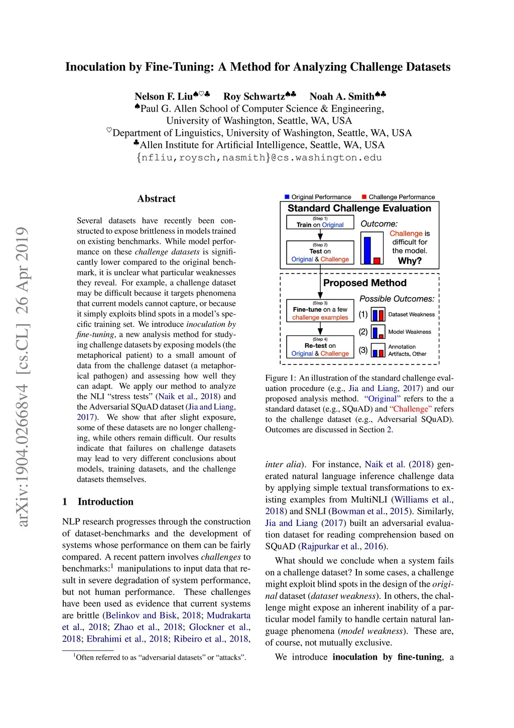 Inoculation by Fine-Tuning: A Method for Analyzing Challenge Datasets