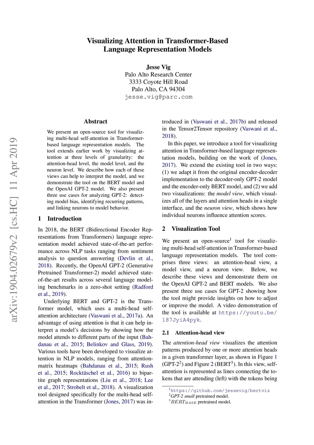 We present an open-source tool for visualizing multi-head self-attention in Transformer-based language representation models. The tool extends earlier work by visualizing attention at three levels of granularity: the attention-head level, the model level, and the neuron level. We describe how each of these views can help to interpret the model, and we demonstrate the tool on the BERT model and the OpenAI GPT-2 model. We also present three use cases for analyzing GPT-2: detecting model bias, identifying recurring patterns, and linking neurons to model behavior.
