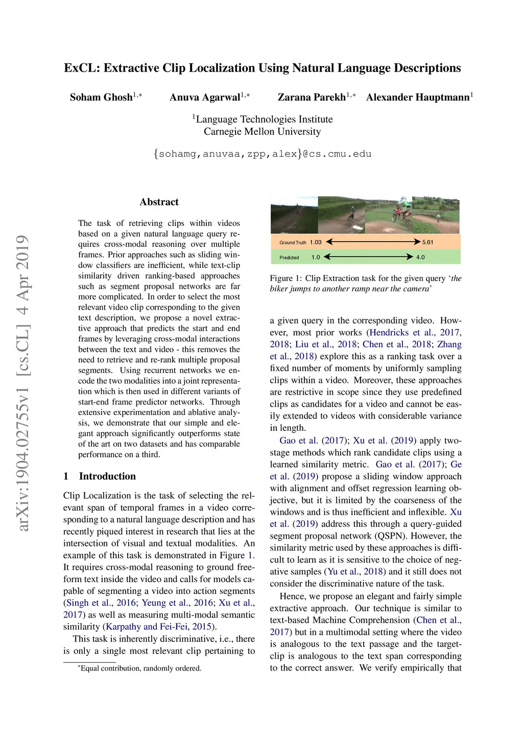 The task of retrieving clips within videos based on a given natural language query requires cross-modal reasoning over multiple frames. Prior approaches such as sliding window classifiers are inefficient, while text-clip similarity driven ranking-based approaches such as segment proposal networks are far more complicated. In order to select the most relevant video clip corresponding to the given text description, we propose a novel extractive approach that predicts the start and end frames by leveraging cross-modal interactions between the text and video - this removes the need to retrieve and re-rank multiple proposal segments. Using recurrent networks we encode the two modalities into a joint representation which is then used in different variants of start-end frame predictor networks. Through extensive experimentation and ablative analysis, we demonstrate that our simple and elegant approach significantly outperforms state of the art on two datasets and has comparable performance on a third.