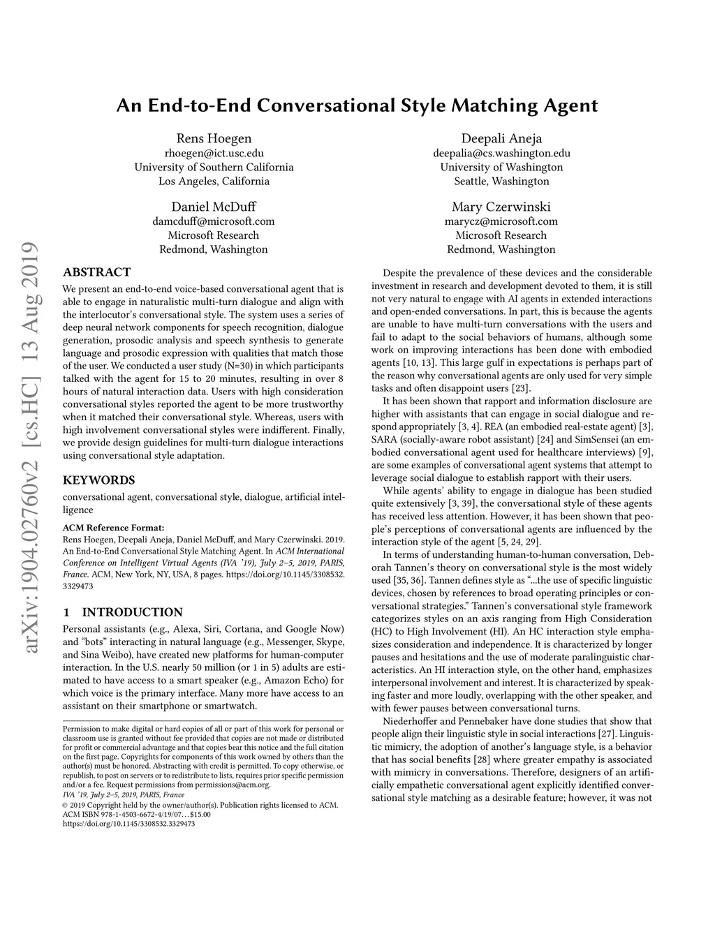 We present an end-to-end voice-based conversational agent that is able to engage in naturalistic multi-turn dialogue and align with the interlocutor's conversational style. The system uses a series of deep neural network components for speech recognition, dialogue generation, prosodic analysis and speech synthesis to generate language and prosodic expression with qualities that match those of the user. We conducted a user study (N=30) in which participants talked with the agent for 15 to 20 minutes, resulting in over 8 hours of natural interaction data. Users with high consideration conversational styles reported the agent to be more trustworthy when it matched their conversational style. Whereas, users with high involvement conversational styles were indifferent. Finally, we provide design guidelines for multi-turn dialogue interactions using conversational style adaptation.