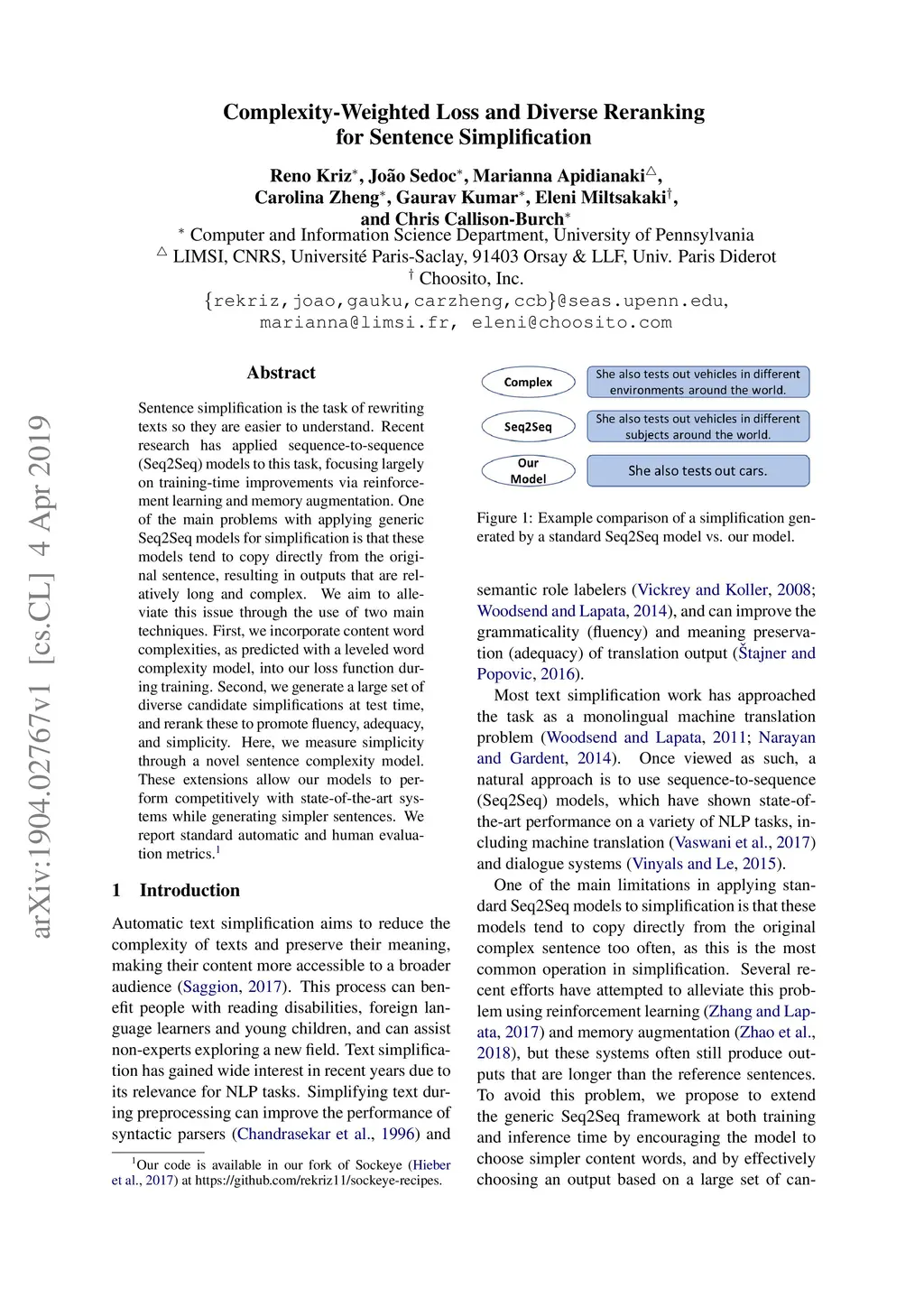 Sentence simplification is the task of rewriting texts so they are easier to understand. Recent research has applied sequence-to-sequence (Seq2Seq) models to this task, focusing largely on training-time improvements via reinforcement learning and memory augmentation. One of the main problems with applying generic Seq2Seq models for simplification is that these models tend to copy directly from the original sentence, resulting in outputs that are relatively long and complex. We aim to alleviate this issue through the use of two main techniques. First, we incorporate content word complexities, as predicted with a leveled word complexity model, into our loss function during training. Second, we generate a large set of diverse candidate simplifications at test time, and rerank these to promote fluency, adequacy, and simplicity. Here, we measure simplicity through a novel sentence complexity model. These extensions allow our models to perform competitively with state-of-the-art systems while generating simpler sentences. We report standard automatic and human evaluation metrics.