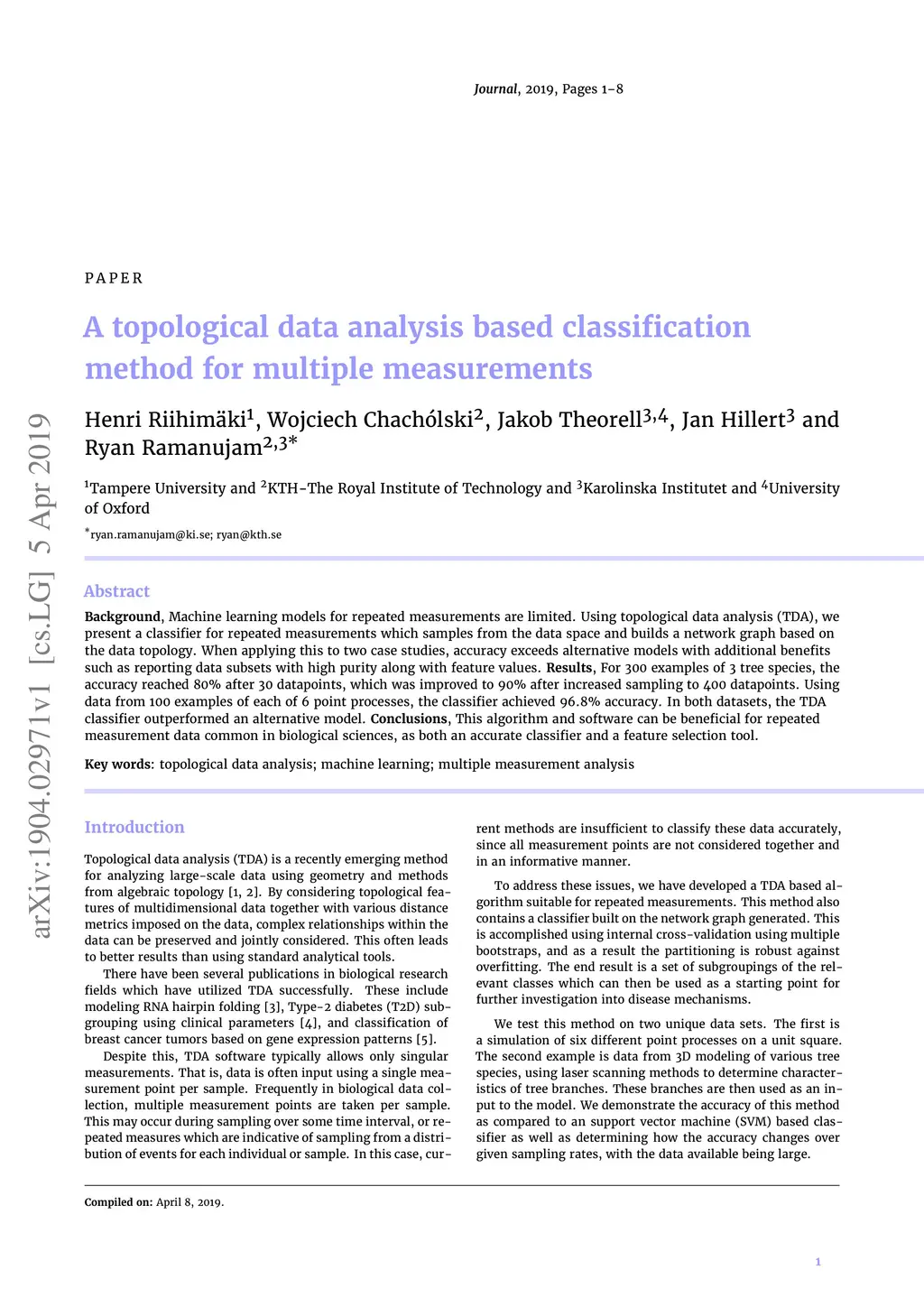 Machine learning models for repeated measurements are limited. Using topological data analysis (TDA), we present a classifier for repeated measurements which samples from the data space and builds a network graph based on the data topology. When applying this to two case studies, accuracy exceeds alternative models with additional benefits such as reporting data subsets with high purity along with feature values. For 300 examples of 3 tree species, the accuracy reached 80% after 30 datapoints, which was improved to 90% after increased sampling to 400 datapoints. Using data from 100 examples of each of 6 point processes, the classifier achieved 96.8% accuracy. In both datasets, the TDA classifier outperformed an alternative model. This algorithm and software can be beneficial for repeated measurement data common in biological sciences, as both an accurate classifier and a feature selection tool.