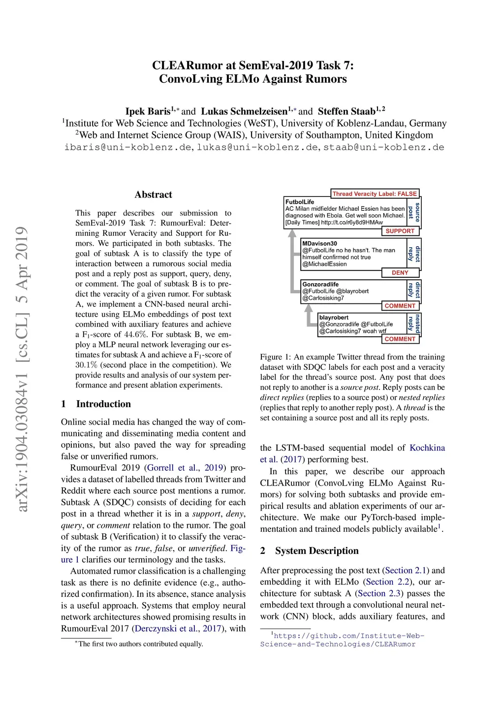 CLEARumor at SemEval-2019 Task 7: ConvoLving ELMo Against Rumors