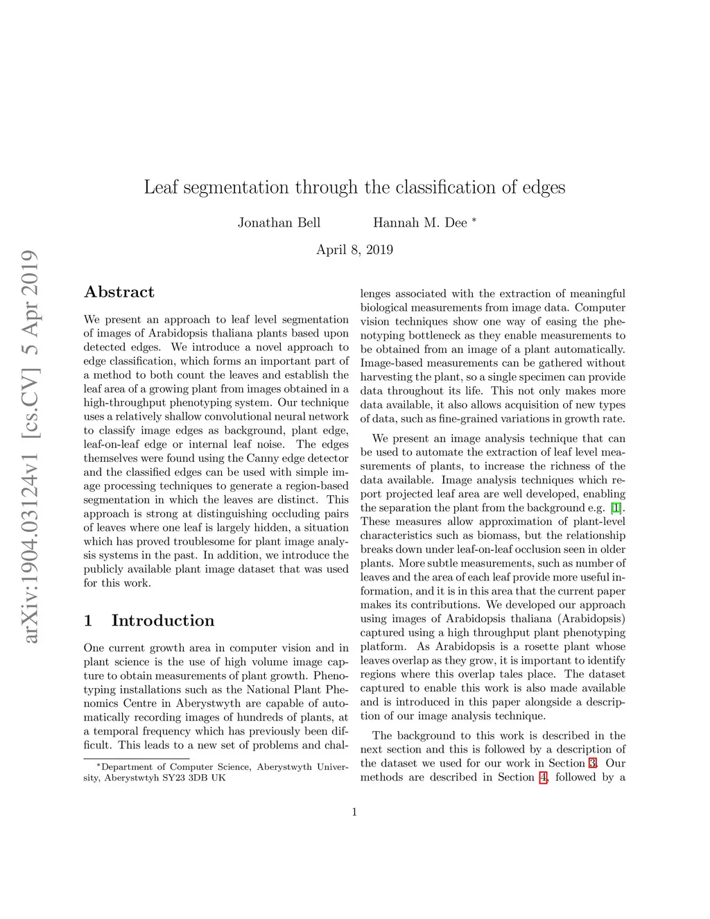 We present an approach to leaf level segmentation of images of Arabidopsis thaliana plants based upon detected edges. We introduce a novel approach to edge classification, which forms an important part of a method to both count the leaves and establish the leaf area of a growing plant from images obtained in a high-throughput phenotyping system. Our technique uses a relatively shallow convolutional neural network to classify image edges as background, plant edge, leaf-on-leaf edge or internal leaf noise. The edges themselves were found using the Canny edge detector and the classified edges can be used with simple image processing techniques to generate a region-based segmentation in which the leaves are distinct. This approach is strong at distinguishing occluding pairs of leaves where one leaf is largely hidden, a situation which has proved troublesome for plant image analysis systems in the past. In addition, we introduce the publicly available plant image dataset that was used for this work.