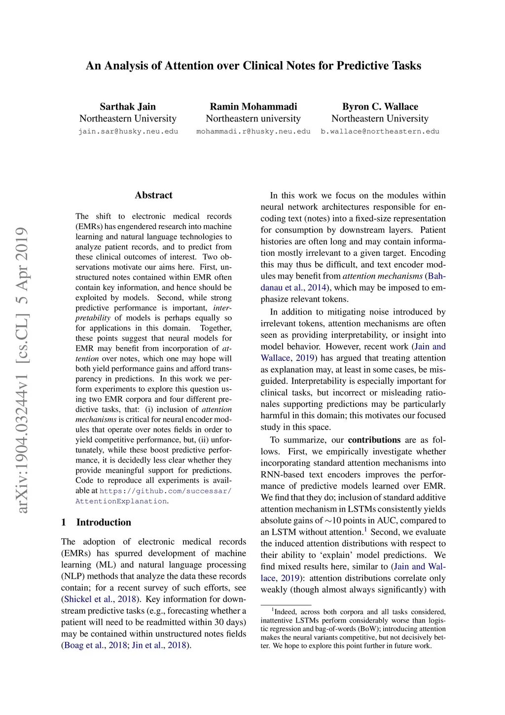 The shift to electronic medical records (EMRs) has engendered research into machine learning and natural language technologies to analyze patient records, and to predict from these clinical outcomes of interest. Two observations motivate our aims here. First, unstructured notes contained within EMR often contain key information, and hence should be exploited by models. Second, while strong predictive performance is important, interpretability of models is perhaps equally so for applications in this domain. Together, these points suggest that neural models for EMR may benefit from incorporation of attention over notes, which one may hope will both yield performance gains and afford transparency in predictions. In this work we perform experiments to explore this question using two EMR corpora and four different predictive tasks, that: (i) inclusion of attention mechanisms is critical for neural encoder modules that operate over notes fields in order to yield competitive performance, but, (ii) unfortunately, while these boost predictive performance, it is decidedly less clear whether they provide meaningful support for predictions.