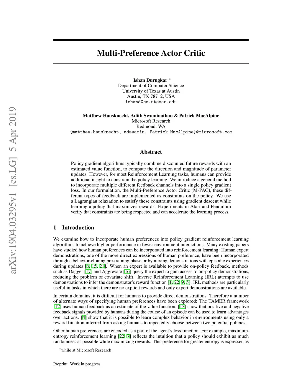 Multi-Preference Actor Critic