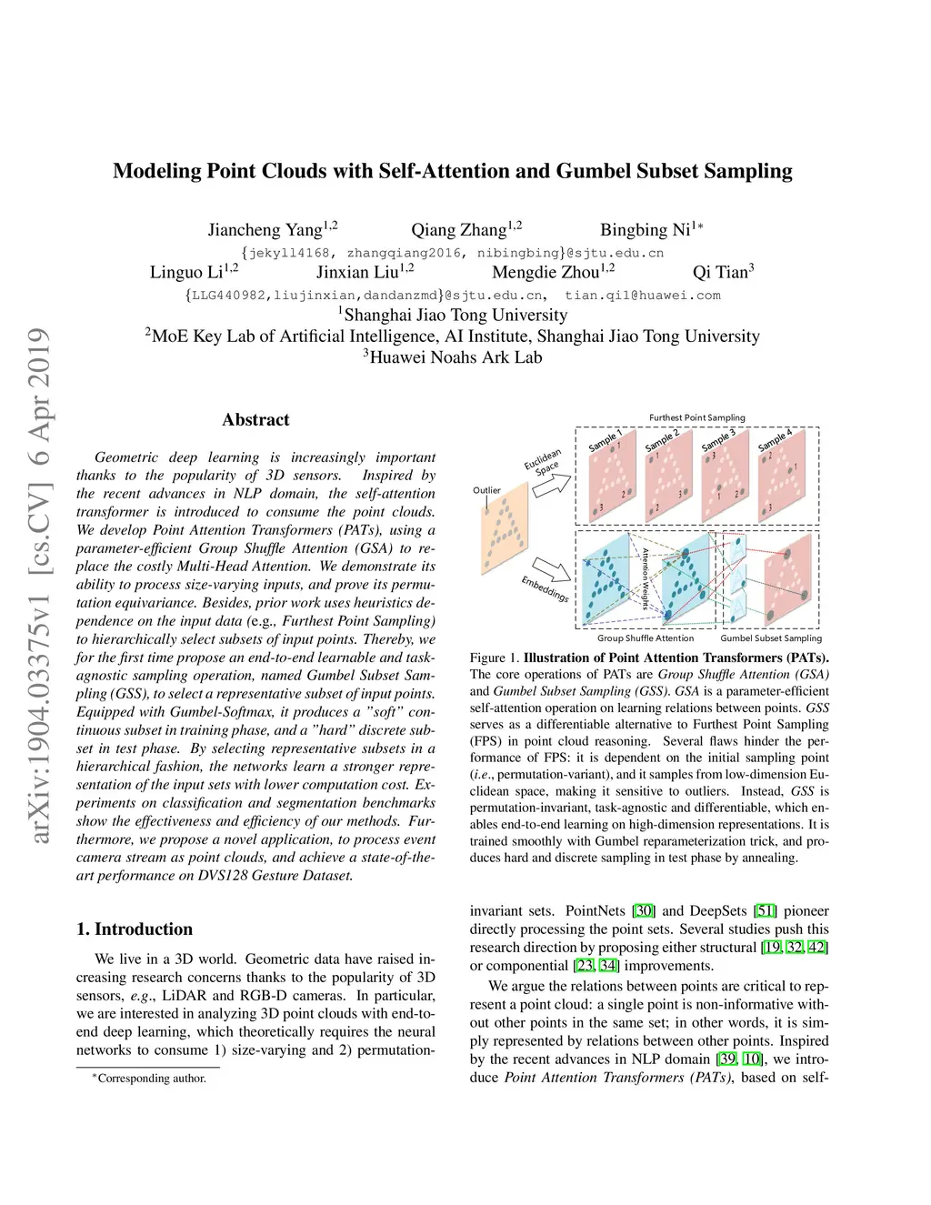 Geometric deep learning is increasingly important thanks to the popularity of 3D sensors. Inspired by the recent advances in NLP domain, the self-attention transformer is introduced to consume the point clouds. We develop Point Attention Transformers (PATs), using a parameter-efficient Group Shuffle Attention (GSA) to replace the costly Multi-Head Attention. We demonstrate its ability to process size-varying inputs, and prove its permutation equivariance. Besides, prior work uses heuristics dependence on the input data (e.g., Furthest Point Sampling) to hierarchically select subsets of input points. Thereby, we for the first time propose an end-to-end learnable and task-agnostic sampling operation, named Gumbel Subset Sampling (GSS), to select a representative subset of input points. Equipped with Gumbel-Softmax, it produces a "soft" continuous subset in training phase, and a "hard" discrete subset in test phase. By selecting representative subsets in a hierarchical fashion, the networks learn a stronger representation of the input sets with lower computation cost. Experiments on classification and segmentation benchmarks show the effectiveness and efficiency of our methods. Furthermore, we propose a novel application, to process event camera stream as point clouds, and achieve a state-of-the-art performance on DVS128 Gesture Dataset.