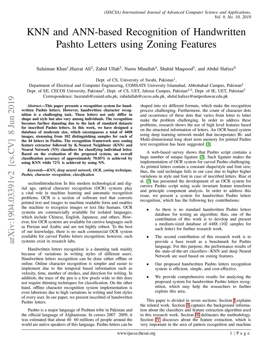 KNN and ANN-based Recognition of Handwritten Pashto Letters using Zoning