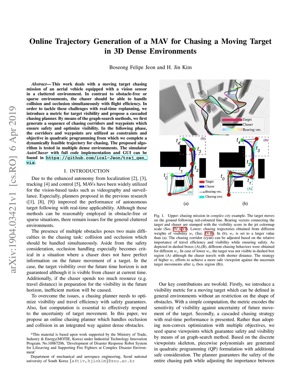 This work deals with a moving target chasing mission of an aerial vehicle equipped with a vision sensor in a cluttered environment. In contrast to obstacle-free or sparse environments, the chaser should be able to handle collision and occlusion simultaneously with flight efficiency. In order to tackle these challenges with real-time replanning, we introduce a metric for target visibility and propose a cascaded chasing planner. By means of the graph-search methods, we first generate a sequence of chasing corridors and waypoints which ensure safety and optimize visibility. In the following phase, the corridors and waypoints are utilized as constraints and objective in quadratic programming from which we complete a dynamically feasible trajectory for chasing. The proposed algorithm is tested in multiple dense environments. The simulator AutoChaser with full code implementation and GUI can be found in https://github.com/icsl-Jeon/traj_gen_vis