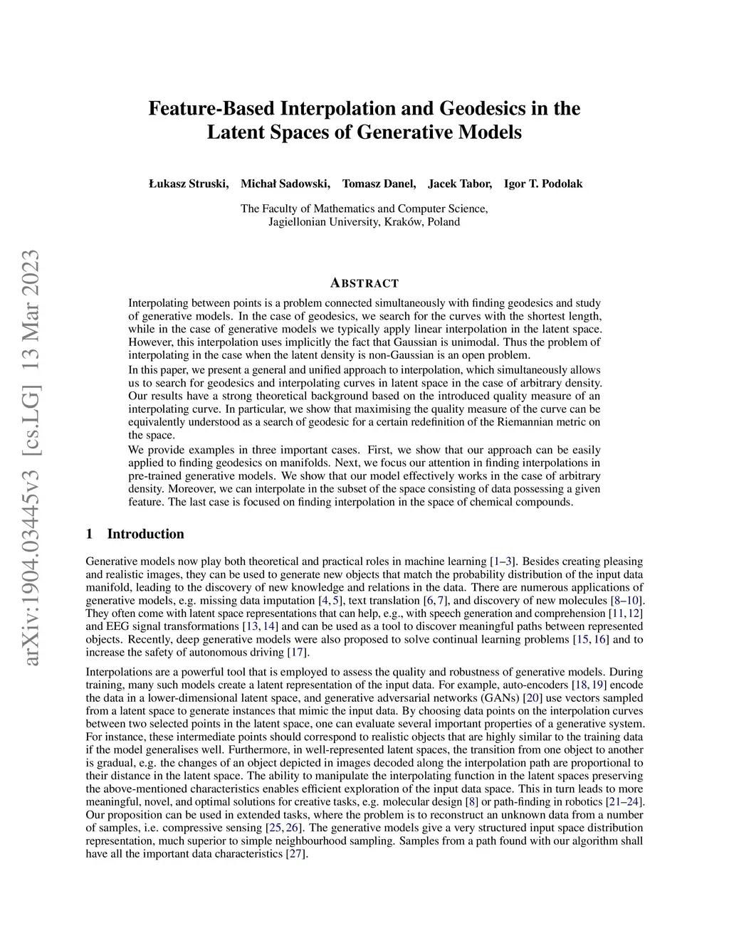 Feature-Based Interpolation and Geodesics in the Latent Spaces of