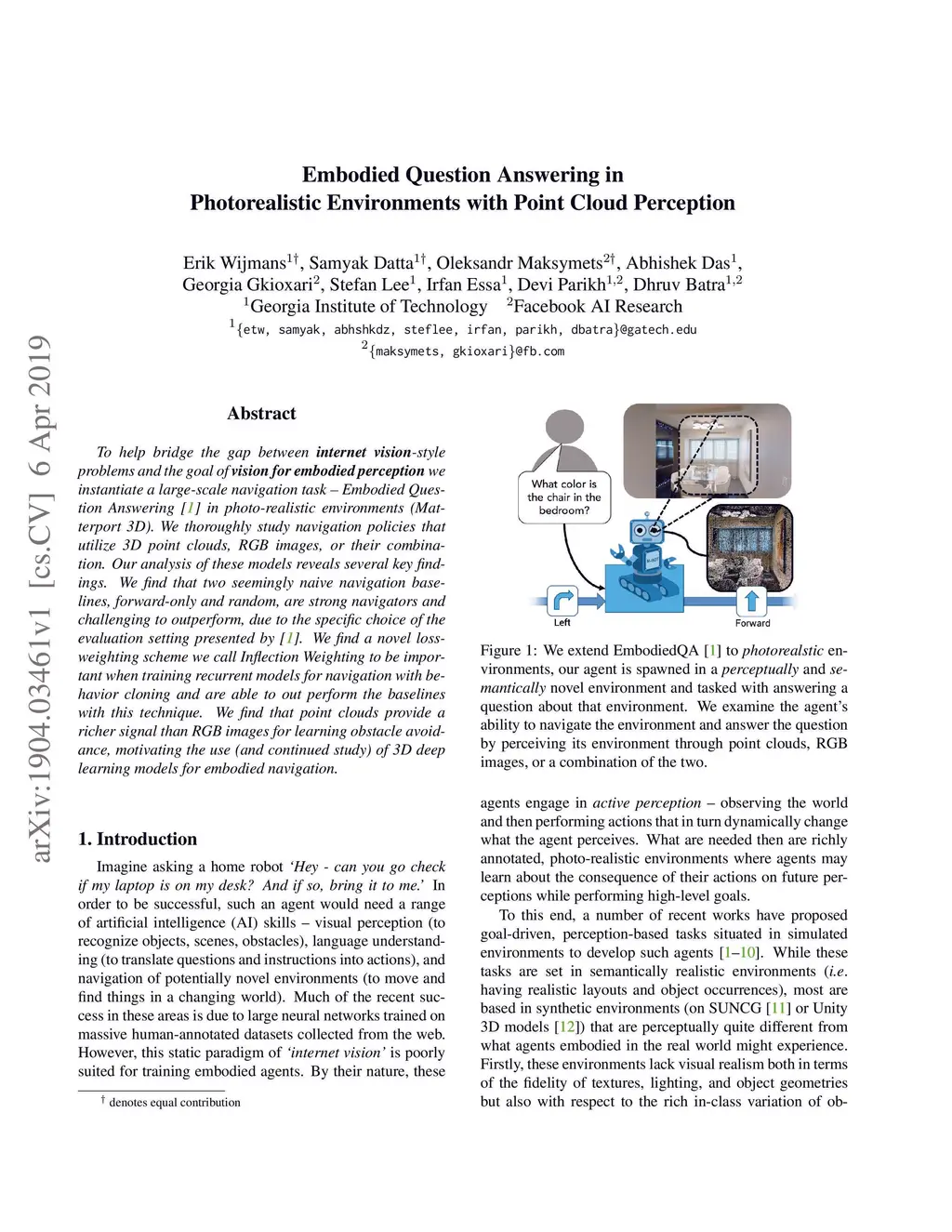 To help bridge the gap between internet vision-style problems and the goal of vision for embodied perception we instantiate a large-scale navigation task -- Embodied Question Answering [1] in photo-realistic environments (Matterport 3D). We thoroughly study navigation policies that utilize 3D point clouds, RGB images, or their combination. Our analysis of these models reveals several key findings. We find that two seemingly naive navigation baselines, forward-only and random, are strong navigators and challenging to outperform, due to the specific choice of the evaluation setting presented by [1]. We find a novel loss-weighting scheme we call Inflection Weighting to be important when training recurrent models for navigation with behavior cloning and are able to out perform the baselines with this technique. We find that point clouds provide a richer signal than RGB images for learning obstacle avoidance, motivating the use (and continued study) of 3D deep learning models for embodied navigation.