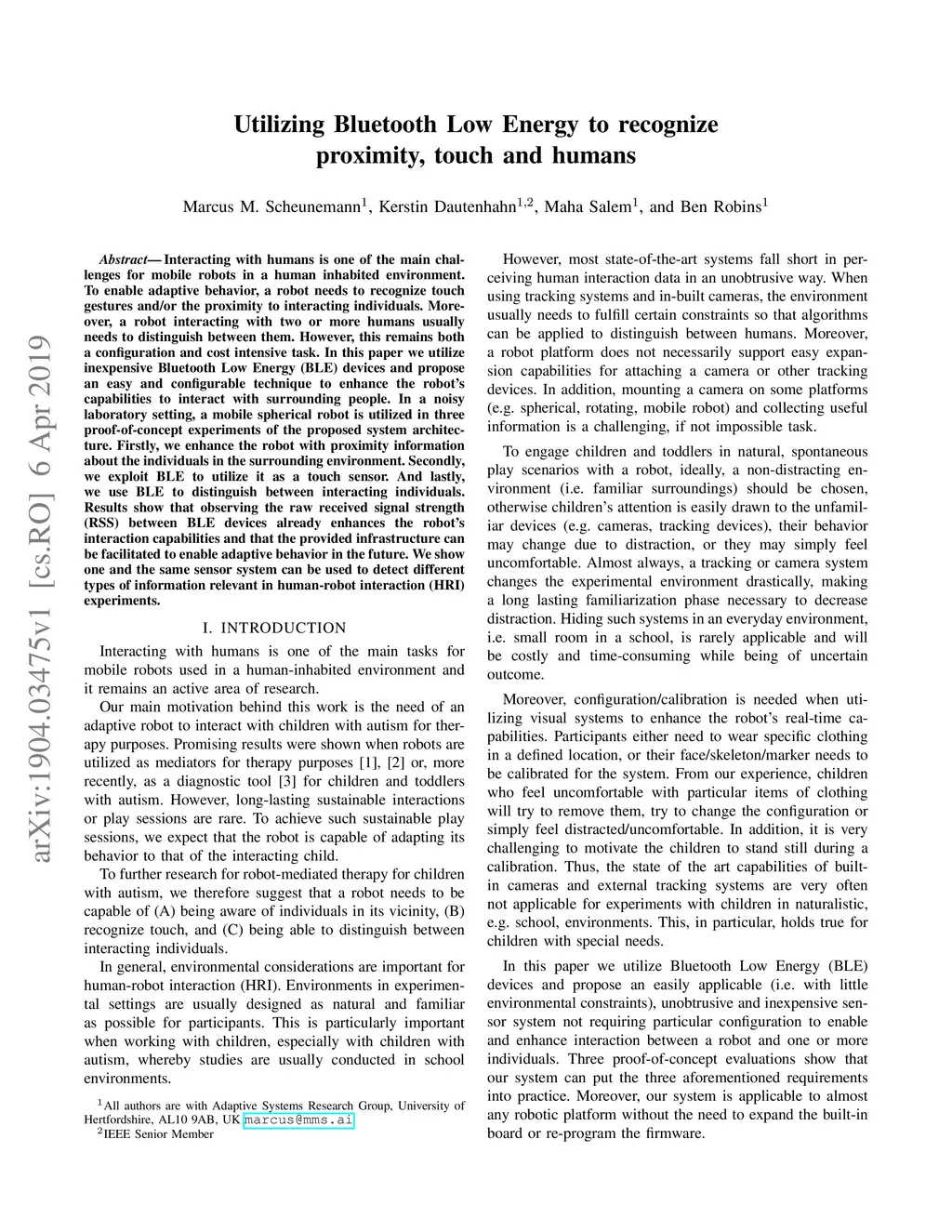 Interacting with humans is one of the main challenges for mobile robots in a human inhabited environment. To enable adaptive behavior, a robot needs to recognize touch gestures and/or the proximity to interacting individuals. Moreover, a robot interacting with two or more humans usually needs to distinguish between them. However, this remains both a configuration and cost intensive task. In this paper we utilize inexpensive Bluetooth Low Energy (BLE) devices and propose an easy and configurable technique to enhance the robot's capabilities to interact with surrounding people. In a noisy laboratory setting, a mobile spherical robot is utilized in three proof-of-concept experiments of the proposed system architecture. Firstly, we enhance the robot with proximity information about the individuals in the surrounding environment. Secondly, we exploit BLE to utilize it as a touch sensor. And lastly, we use BLE to distinguish between interacting individuals. Results show that observing the raw received signal strength (RSS) between BLE devices already enhances the robot's interaction capabilities and that the provided infrastructure can be facilitated to enable adaptive behavior in the future. We show one and the same sensor system can be used to detect different types of information relevant in human-robot interaction (HRI) experiments.
