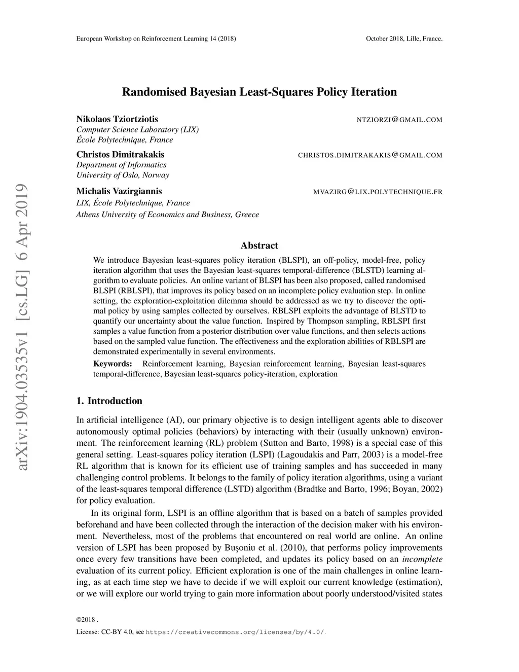 We introduce Bayesian least-squares policy iteration (BLSPI), an off-policy, model-free, policy iteration algorithm that uses the Bayesian least-squares temporal-difference (BLSTD) learning algorithm to evaluate policies. An online variant of BLSPI has been also proposed, called randomised BLSPI (RBLSPI), that improves its policy based on an incomplete policy evaluation step. In online setting, the exploration-exploitation dilemma should be addressed as we try to discover the optimal policy by using samples collected by ourselves. RBLSPI exploits the advantage of BLSTD to quantify our uncertainty about the value function. Inspired by Thompson sampling, RBLSPI first samples a value function from a posterior distribution over value functions, and then selects actions based on the sampled value function. The effectiveness and the exploration abilities of RBLSPI are demonstrated experimentally in several environments.