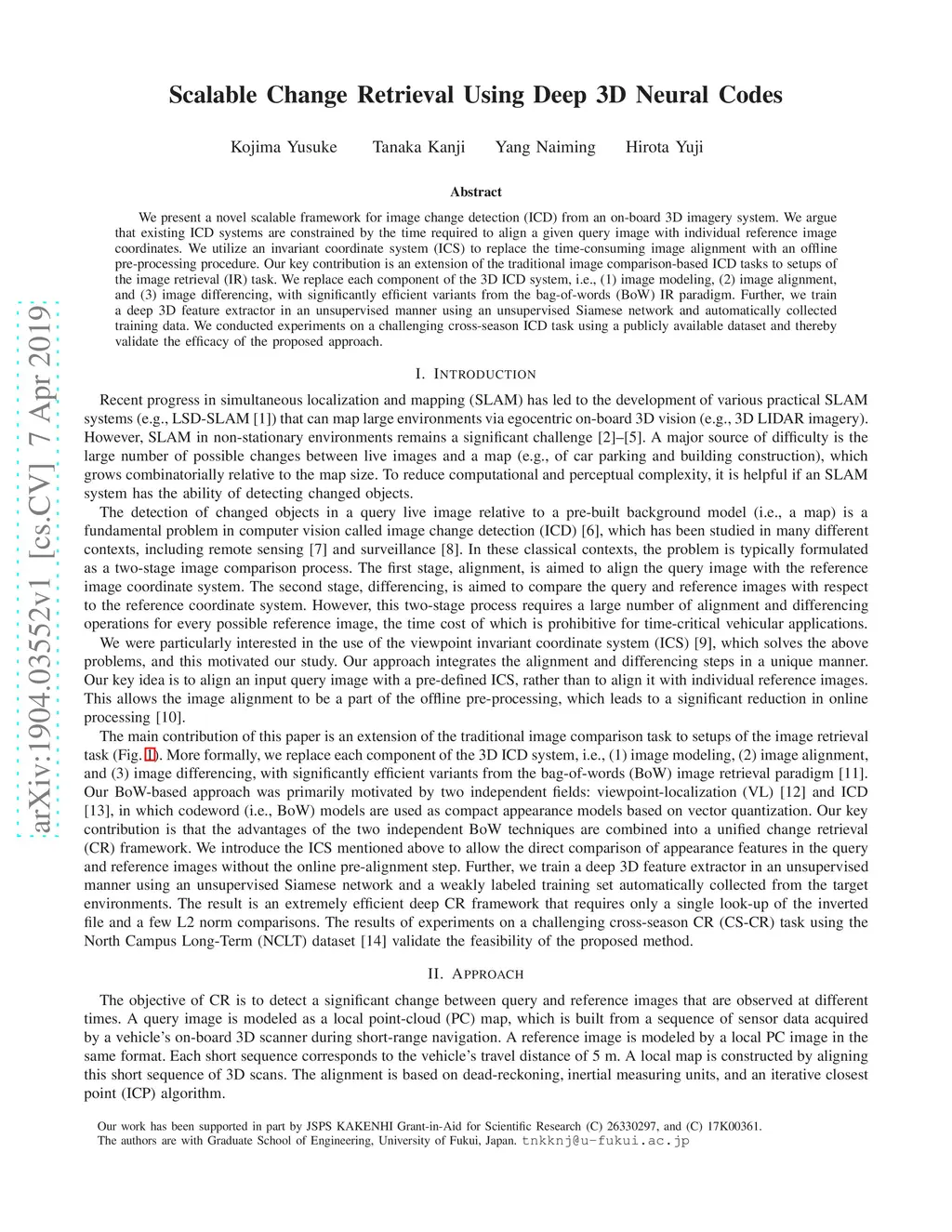We present a novel scalable framework for image change detection (ICD) from an on-board 3D imagery system. We argue that existing ICD systems are constrained by the time required to align a given query image with individual reference image coordinates. We utilize an invariant coordinate system (ICS) to replace the time-consuming image alignment with an offline pre-processing procedure. Our key contribution is an extension of the traditional image comparison-based ICD tasks to setups of the image retrieval (IR) task. We replace each component of the 3D ICD system, i.e., (1) image modeling, (2) image alignment, and (3) image differencing, with significantly efficient variants from the bag-of-words (BoW) IR paradigm. Further, we train a deep 3D feature extractor in an unsupervised manner using an unsupervised Siamese network and automatically collected training data. We conducted experiments on a challenging cross-season ICD task using a publicly available dataset and thereby validate the efficacy of the proposed approach.