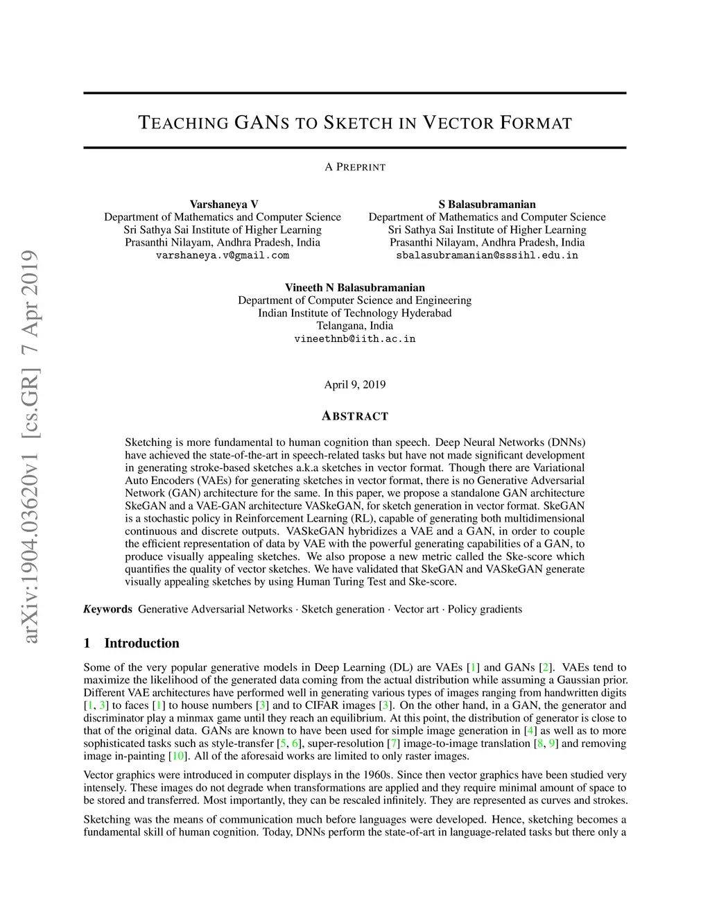 Sketching is more fundamental to human cognition than speech. Deep Neural Networks (DNNs) have achieved the state-of-the-art in speech-related tasks but have not made significant development in generating stroke-based sketches a.k.a sketches in vector format. Though there are Variational Auto Encoders (VAEs) for generating sketches in vector format, there is no Generative Adversarial Network (GAN) architecture for the same. In this paper, we propose a standalone GAN architecture SkeGAN and a VAE-GAN architecture VASkeGAN, for sketch generation in vector format. SkeGAN is a stochastic policy in Reinforcement Learning (RL), capable of generating both multidimensional continuous and discrete outputs. VASkeGAN hybridizes a VAE and a GAN, in order to couple the efficient representation of data by VAE with the powerful generating capabilities of a GAN, to produce visually appealing sketches. We also propose a new metric called the Ske-score which quantifies the quality of vector sketches. We have validated that SkeGAN and VASkeGAN generate visually appealing sketches by using Human Turing Test and Ske-score.