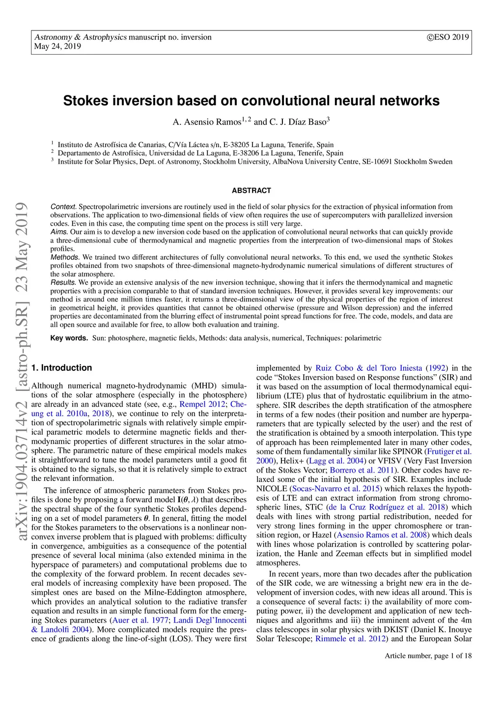 Spectropolarimetric inversions are routinely used in the field of Solar Physics for the extraction of physical information from observations. The application to two-dimensional fields of view often requires the use of supercomputers with parallelized inversion codes. Even in this case, the computing time spent on the process is still very large. Our aim is to develop a new inversion code based on the application of convolutional neural networks that can quickly provide a three-dimensional cube of thermodynamical and magnetic properties from the interpretation of two-dimensional maps of Stokes profiles. We train two different architectures of fully convolutional neural networks. To this end, we use the synthetic Stokes profiles obtained from two snapshots of three-dimensional magneto-hydrodynamic numerical simulations of different structures of the solar atmosphere. We provide an extensive analysis of the new inversion technique, showing that it infers the thermodynamical and magnetic properties with a precision comparable to that of standard inversion techniques. However, it provides several key improvements: our method is around one million times faster, it returns a three-dimensional view of the physical properties of the region of interest in geometrical height, it provides quantities that cannot be obtained otherwise (pressure and Wilson depression) and the inferred properties are decontaminated from the blurring effect of instrumental point spread functions for free. The code is provided for free on a specific repository, with options for training and evaluation.