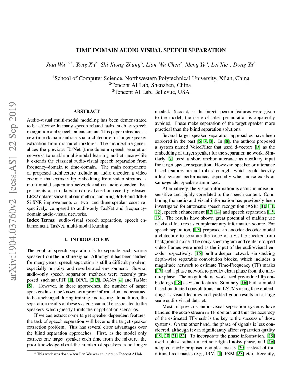 Audio-visual multi-modal modeling has been demonstrated to be effective in many speech related tasks, such as speech recognition and speech enhancement. This paper introduces a new time-domain audio-visual architecture for target speaker extraction from monaural mixtures. The architecture generalizes the previous TasNet (time-domain speech separation network) to enable multi-modal learning and at meanwhile it extends the classical audio-visual speech separation from frequency-domain to time-domain. The main components of proposed architecture include an audio encoder, a video encoder that extracts lip embedding from video streams, a multi-modal separation network and an audio decoder. Experiments on simulated mixtures based on recently released LRS2 dataset show that our method can bring 3dB+ and 4dB+ Si-SNR improvements on two- and three-speaker cases respectively, compared to audio-only TasNet and frequency-domain audio-visual networks