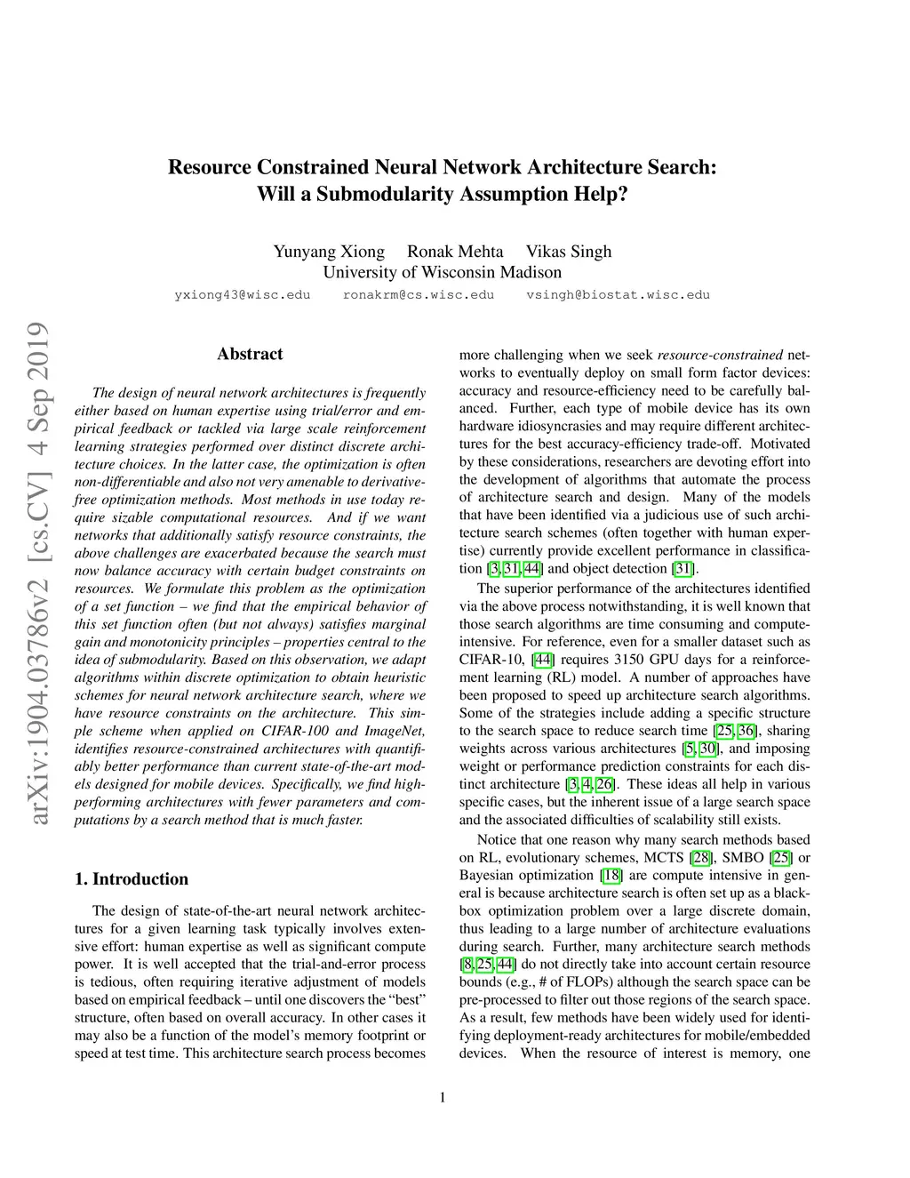 The design of neural network architectures is frequently either based on human expertise using trial/error and empirical feedback or tackled via large scale reinforcement learning strategies run over distinct discrete architecture choices. In the latter case, the optimization task is non-differentiable and also not very amenable to derivative-free optimization methods. Most methods in use today require exorbitant computational resources. And if we want networks that additionally satisfy resource constraints, the above challenges are exacerbated because the search procedure must now balance accuracy with certain budget constraints on resources. We formulate this problem as the optimization of a set function - we find that the empirical behavior of this set function often (but not always) satisfies marginal gain and monotonicity principles - properties central to the idea of submodularity. Based on this observation, we adapt algorithms that are well-known within discrete optimization to obtain heuristic schemes for neural network architecture search, with resource constraints on the architecture. This simple scheme when applied on CIFAR-100 and ImageNet, identifies resource-constrained architectures with quantifiably better performance than current state-of-the-art models designed for mobile devices. Specifically, we find high-performing architectures with fewer parameters and computations by a search method that is much faster.
