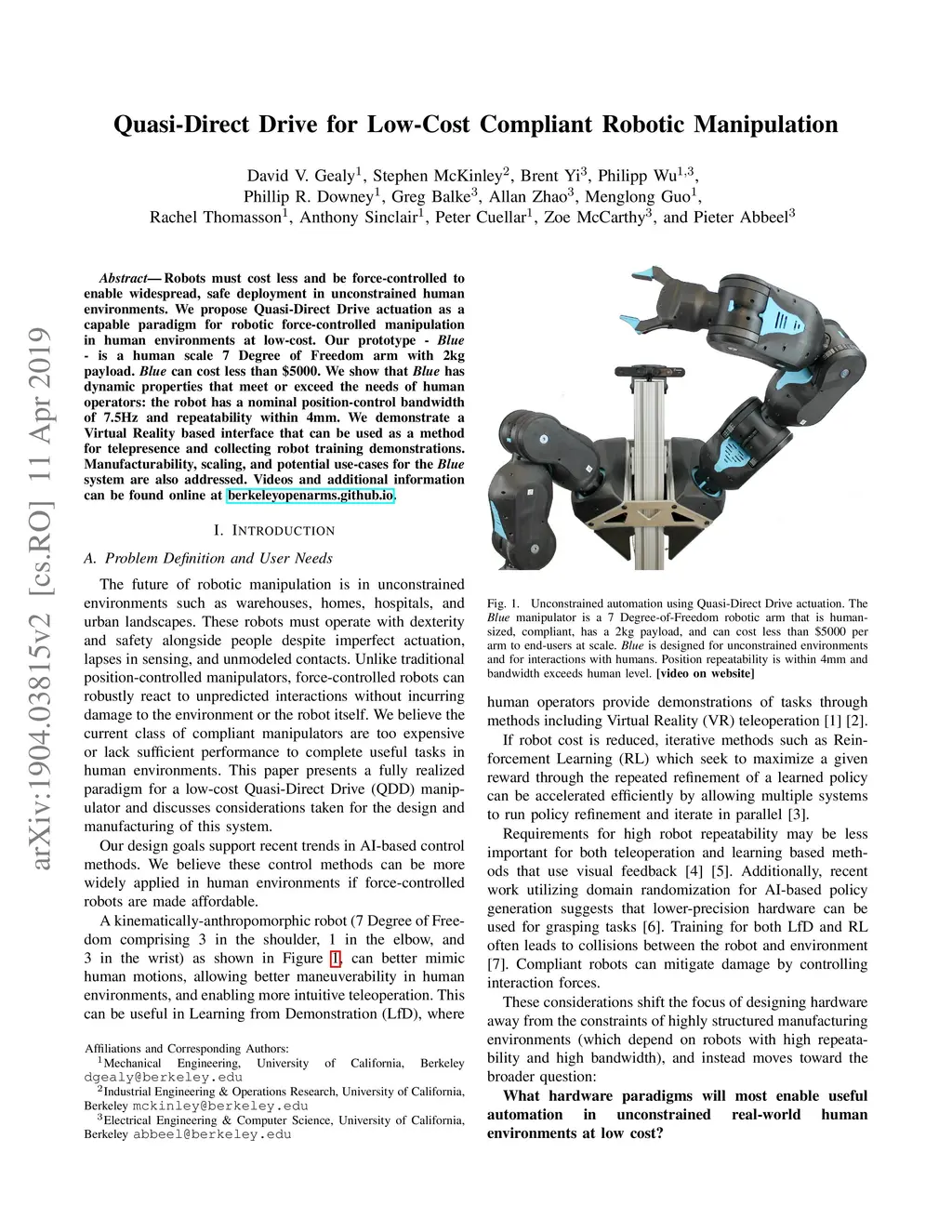 Robots must cost less and be force-controlled to enable widespread, safe deployment in unconstrained human environments. We propose Quasi-Direct Drive actuation as a capable paradigm for robotic force-controlled manipulation in human environments at low-cost. Our prototype - Blue - is a human scale 7 Degree of Freedom arm with 2kg payload. Blue can cost less than $5000. We show that Blue has dynamic properties that meet or exceed the needs of human operators: the robot has a nominal position-control bandwidth of 7.5Hz and repeatability within 4mm. We demonstrate a Virtual Reality based interface that can be used as a method for telepresence and collecting robot training demonstrations. Manufacturability, scaling, and potential use-cases for the Blue system are also addressed. Videos and additional information can be found online at berkeleyopenarms.github.io