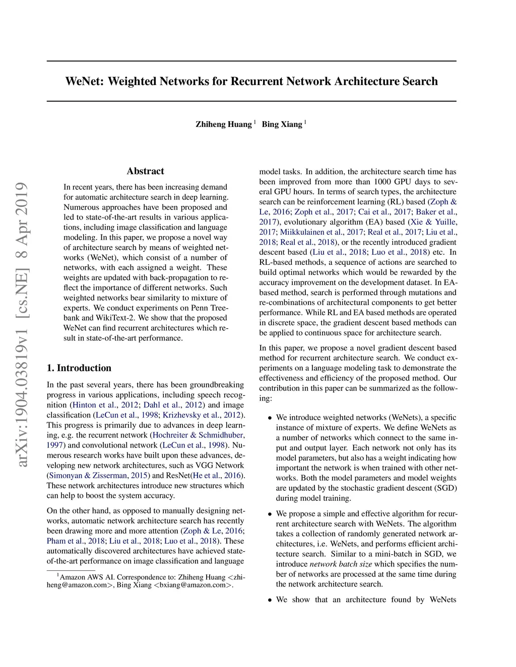 In recent years, there has been increasing demand for automatic architecture search in deep learning. Numerous approaches have been proposed and led to state-of-the-art results in various applications, including image classification and language modeling. In this paper, we propose a novel way of architecture search by means of weighted networks (WeNet), which consist of a number of networks, with each assigned a weight. These weights are updated with back-propagation to reflect the importance of different networks. Such weighted networks bear similarity to mixture of experts. We conduct experiments on Penn Treebank and WikiText-2. We show that the proposed WeNet can find recurrent architectures which result in state-of-the-art performance.