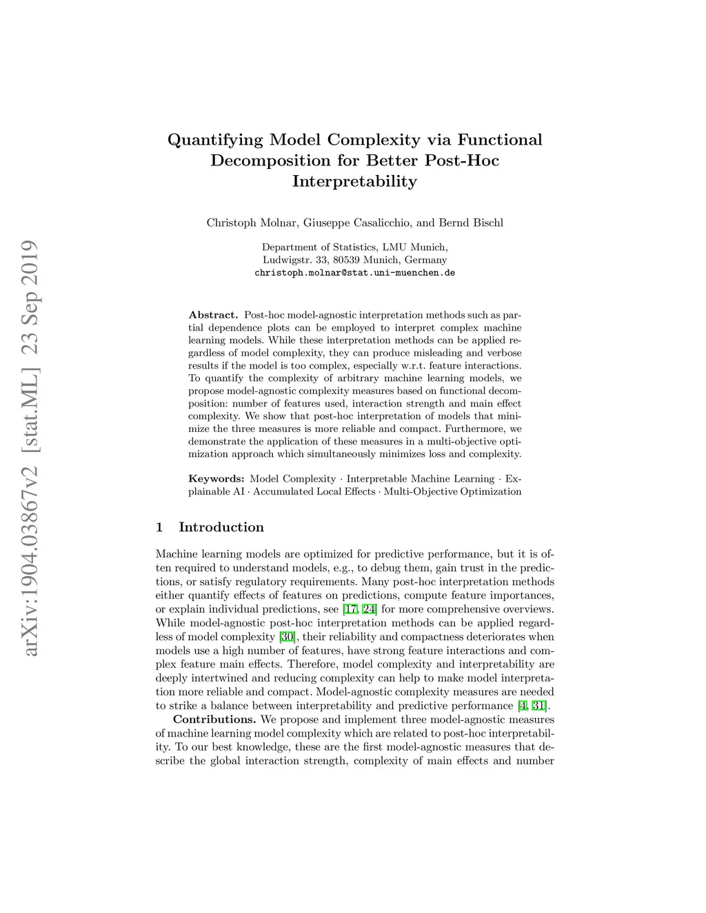 Post-hoc model-agnostic interpretation methods such as partial dependence plots can be employed to interpret complex machine learning models. While these interpretation methods can be applied regardless of model complexity, they can produce misleading and verbose results if the model is too complex, especially w.r.t. feature interactions. To quantify the complexity of arbitrary machine learning models, we propose model-agnostic complexity measures based on functional decomposition: number of features used, interaction strength and main effect complexity. We show that post-hoc interpretation of models that minimize the three measures is more reliable and compact. Furthermore, we demonstrate the application of these measures in a multi-objective optimization approach which simultaneously minimizes loss and complexity.