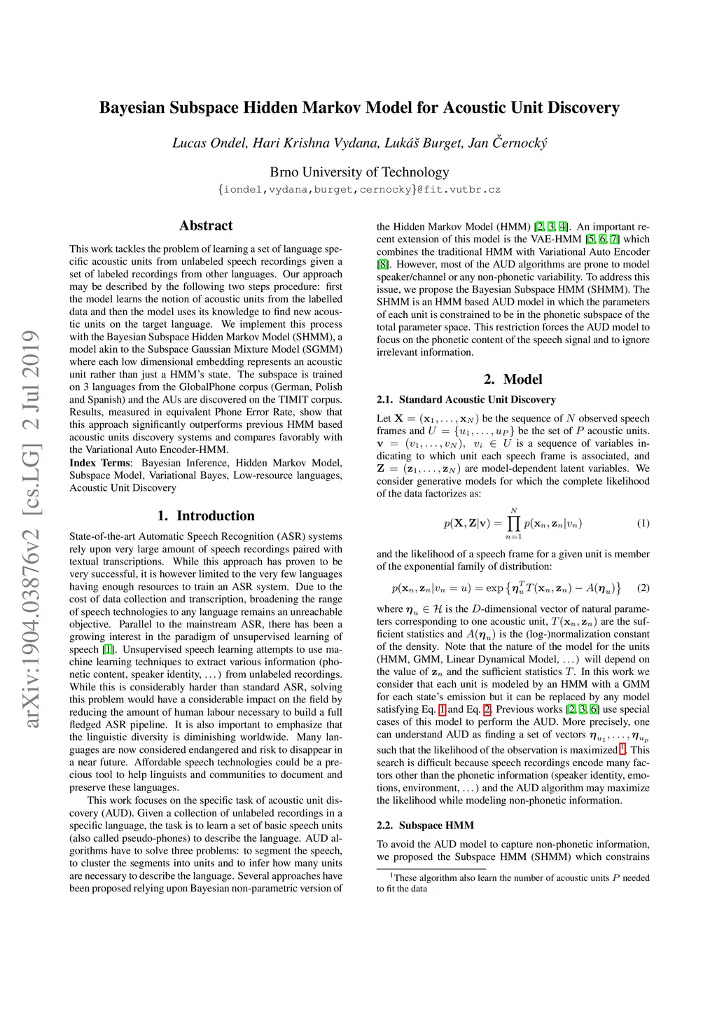 Bayesian Subspace Hidden Markov Model for Acoustic Unit Discovery