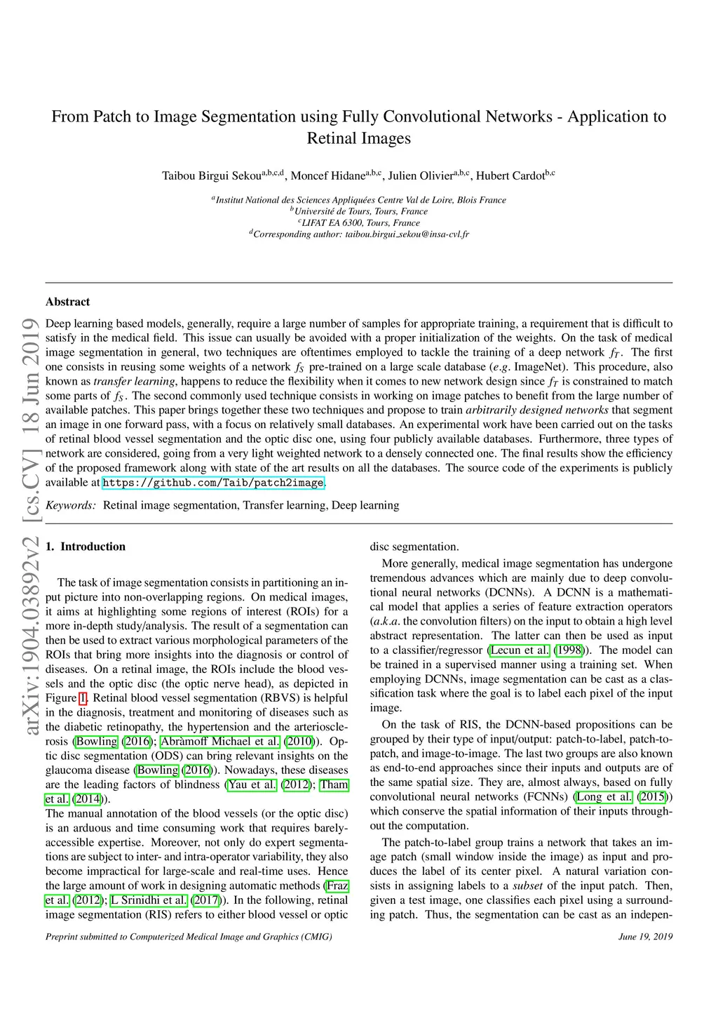 Deep learning based models, generally, require a large number of samples for appropriate training, a requirement that is difficult to satisfy in the medical field. This issue can usually be avoided with a proper initialization of the weights. On the task of medical image segmentation in general, two techniques are oftentimes employed to tackle the training of a deep network . The first one consists in reusing some weights of a network pre-trained on a large scale database ( ImageNet). This procedure, also known as , happens to reduce the flexibility when it comes to new network design since is constrained to match some parts of . The second commonly used technique consists in working on image patches to benefit from the large number of available patches. This paper brings together these two techniques and propose to train that segment an image in one forward pass, with a focus on relatively small databases. An experimental work have been carried out on the tasks of retinal blood vessel segmentation and the optic disc one, using four publicly available databases. Furthermore, three types of network are considered, going from a very light weighted network to a densely connected one. The final results show the efficiency of the proposed framework along with state of the art results on all the databases.