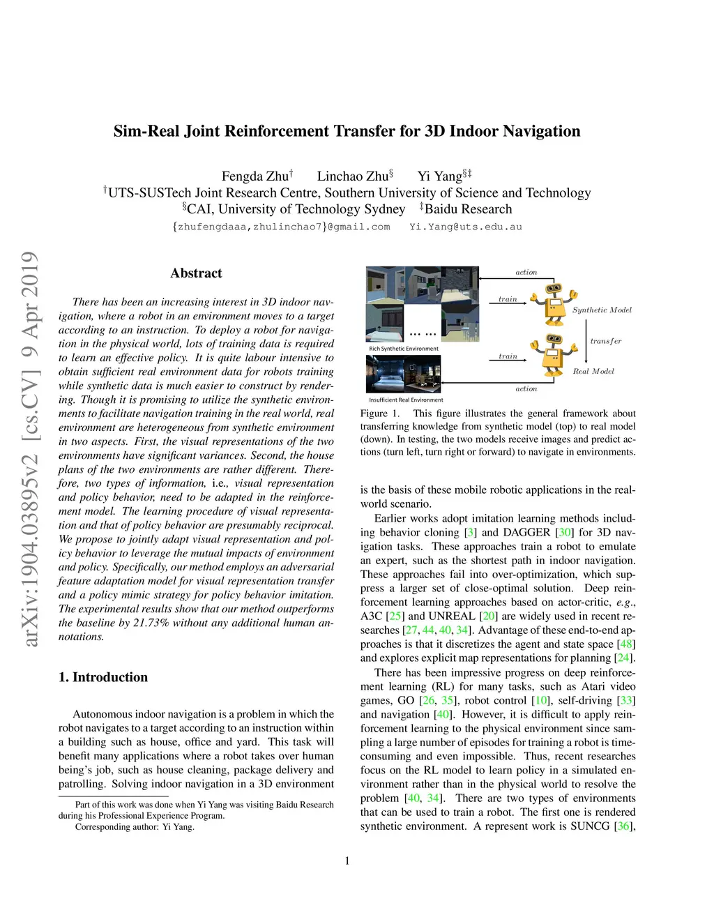 There has been an increasing interest in 3D indoor navigation, where a robot in an environment moves to a target according to an instruction. To deploy a robot for navigation in the physical world, lots of training data is required to learn an effective policy. It is quite labour intensive to obtain sufficient real environment data for training robots while synthetic data is much easier to construct by rendering. Though it is promising to utilize the synthetic environments to facilitate navigation training in the real world, real environment are heterogeneous from synthetic environment in two aspects. First, the visual representation of the two environments have significant variances. Second, the houseplans of these two environments are quite different. Therefore two types of information, i.e. visual representation and policy behavior, need to be adapted in the reinforcement model. The learning procedure of visual representation and that of policy behavior are presumably reciprocal. We propose to jointly adapt visual representation and policy behavior to leverage the mutual impacts of environment and policy. Specifically, our method employs an adversarial feature adaptation model for visual representation transfer and a policy mimic strategy for policy behavior imitation. Experiment shows that our method outperforms the baseline by 19.47% without any additional human annotations.
