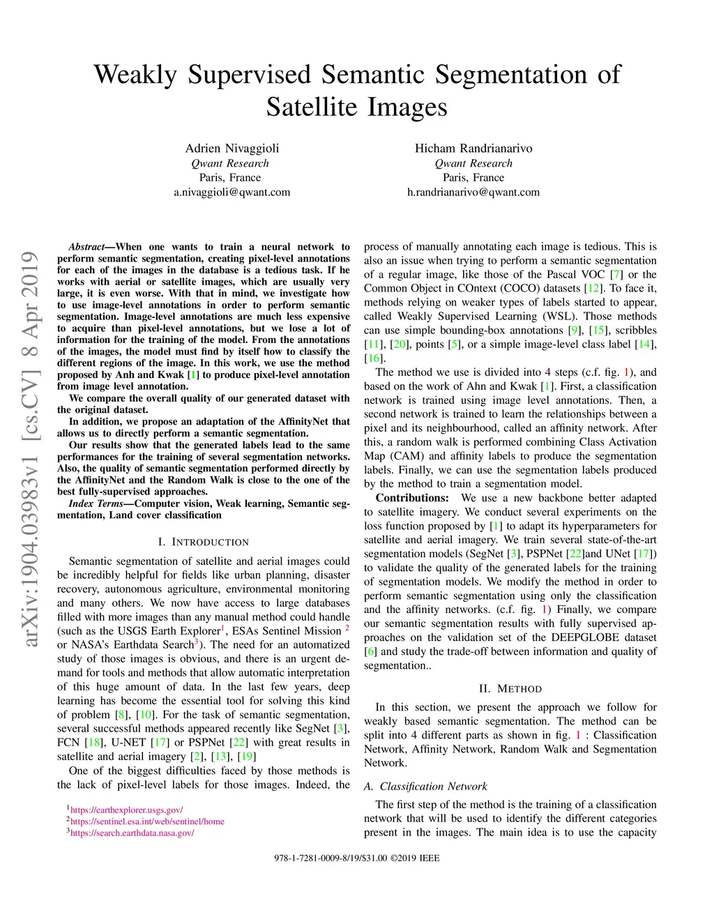When one wants to train a neural network to perform semantic segmentation, creating pixel-level annotations for each of the images in the database is a tedious task. If he works with aerial or satellite images, which are usually very large, it is even worse. With that in mind, we investigate how to use image-level annotations in order to perform semantic segmentation. Image-level annotations are much less expensive to acquire than pixel-level annotations, but we lose a lot of information for the training of the model. From the annotations of the images, the model must find by itself how to classify the different regions of the image. In this work, we use the method proposed by Anh and Kwak [1] to produce pixel-level annotation from image level annotation. We compare the overall quality of our generated dataset with the original dataset. In addition, we propose an adaptation of the AffinityNet that allows us to directly perform a semantic segmentation. Our results show that the generated labels lead to the same performances for the training of several segmentation networks. Also, the quality of semantic segmentation performed directly by the AffinityNet and the Random Walk is close to the one of the best fully-supervised approaches.
