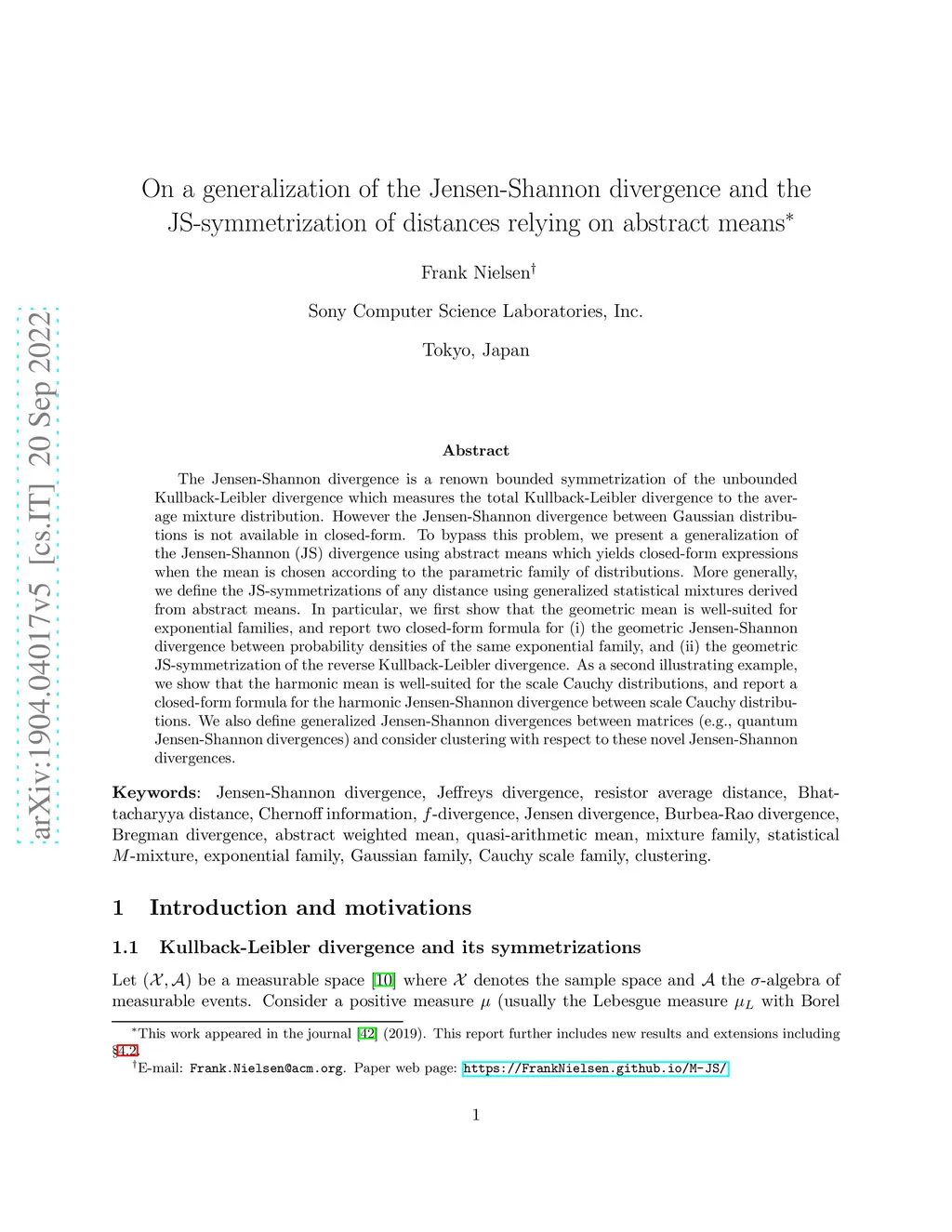 The Jensen-Shannon divergence is a renown bounded symmetrization of the unbounded Kullback-Leibler divergence which measures the total Kullback-Leibler divergence to the average mixture distribution. However the Jensen-Shannon divergence between Gaussian distributions is not available in closed-form. To bypass this problem, we present a generalization of the Jensen-Shannon (JS) divergence using abstract means which yields closed-form expressions when the mean is chosen according to the parametric family of distributions. More generally, we define the JS-symmetrizations of any distance using generalized statistical mixtures derived from abstract means. In particular, we first show that the geometric mean is well-suited for exponential families, and report two closed-form formula for (i) the geometric Jensen-Shannon divergence between probability densities of the same exponential family, and (ii) the geometric JS-symmetrization of the reverse Kullback-Leibler divergence. As a second illustrating example, we show that the harmonic mean is well-suited for the scale Cauchy distributions, and report a closed-form formula for the harmonic Jensen-Shannon divergence between scale Cauchy distributions. We also define generalized Jensen-Shannon divergences between matrices (e.g., quantum Jensen-Shannon divergences) and consider clustering with respect to these novel Jensen-Shannon divergences.