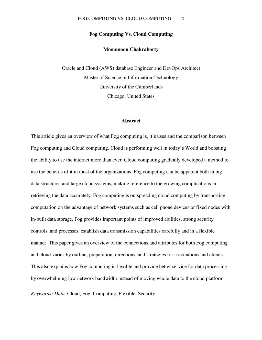 This article gives an overview of what Fog computing is, its uses and the comparison between Fog computing and Cloud computing. Cloud is performing well in todays World and boosting the ability to use the internet more than ever. Cloud computing gradually developed a method to use the benefits of it in most of the organizations. Fog computing can be apparent both in big data structures and large cloud systems, making reference to the growing complications in retrieving the data accurately. Fog computing is outspreading cloud computing by transporting computation on the advantage of network systems such as cell phone devices or fixed nodes with in-built data storage. Fog provides important points of improved abilities, strong security controls, and processes, establish data transmission capabilities carefully and in a flexible manner. This paper gives an overview of the connections and attributes for both Fog computing and cloud varies by outline, preparation, directions, and strategies for associations and clients. This also explains how Fog computing is flexible and provide better service for data processing by overwhelming low network bandwidth instead of moving whole data to the cloud platform.