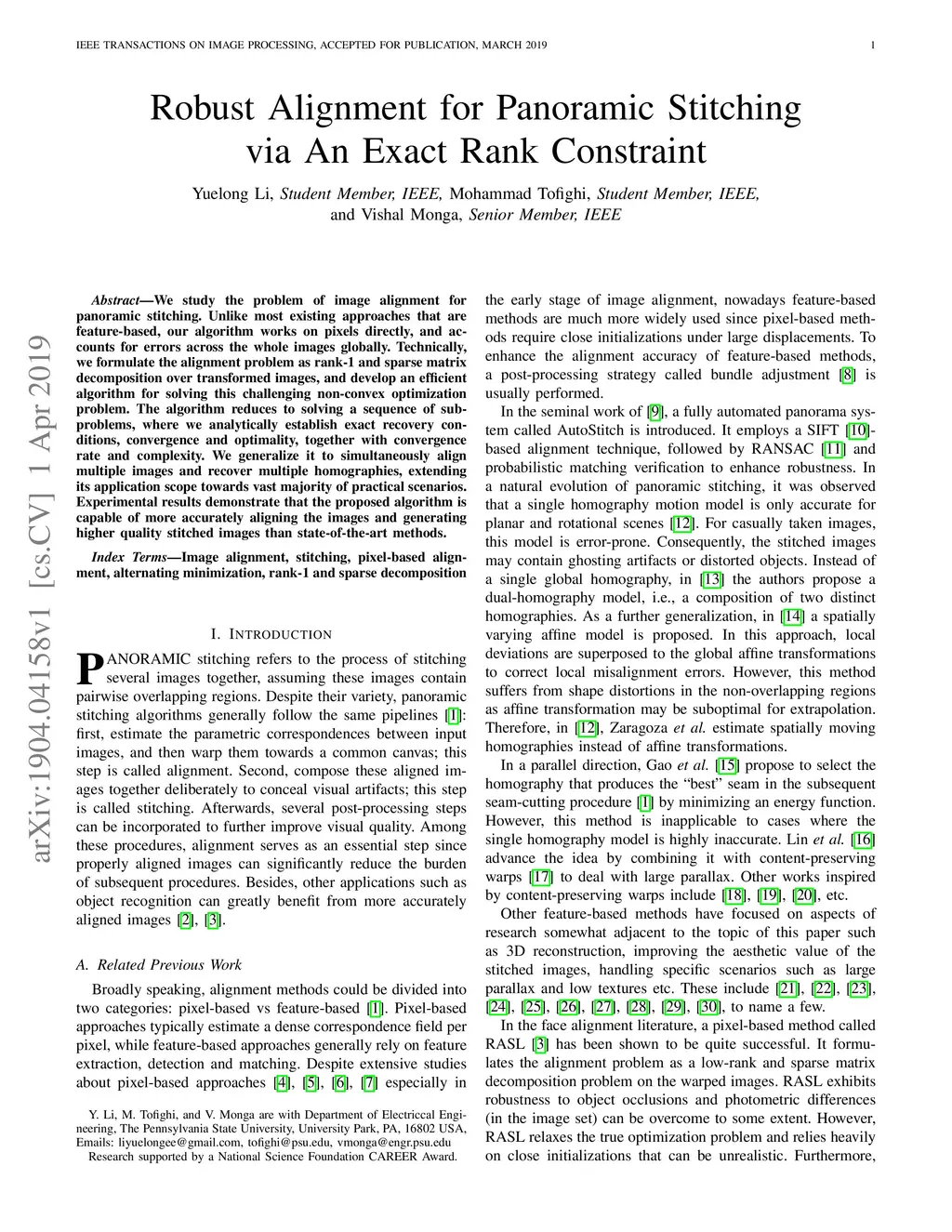 We study the problem of image alignment for panoramic stitching. Unlike most existing approaches that are feature-based, our algorithm works on pixels directly, and accounts for errors across the whole images globally. Technically, we formulate the alignment problem as rank-1 and sparse matrix decomposition over transformed images, and develop an efficient algorithm for solving this challenging non-convex optimization problem. The algorithm reduces to solving a sequence of subproblems, where we analytically establish exact recovery conditions, convergence and optimality, together with convergence rate and complexity. We generalize it to simultaneously align multiple images and recover multiple homographies, extending its application scope towards vast majority of practical scenarios. Experimental results demonstrate that the proposed algorithm is capable of more accurately aligning the images and generating higher quality stitched images than state-of-the-art methods.