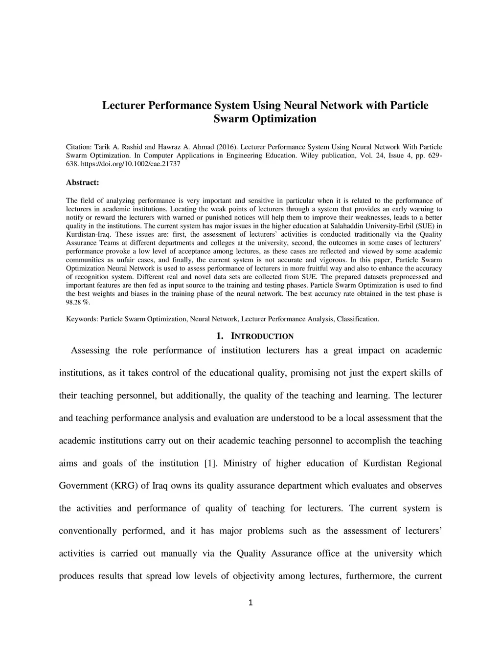 The field of analyzing performance is very important and sensitive in particular when it is related to the performance of lecturers in academic institutions. Locating the weak points of lecturers through a system that provides an early warning to notify or reward the lecturers with warned or punished notices will help them to improve their weaknesses, leads to a better quality in the institutions. The current system has major issues in the higher education at Salahaddin University-Erbil (SUE) in Kurdistan-Iraq. These issues are: first, the assessment of lecturers' activities is conducted traditionally via the Quality Assurance Teams at different departments and colleges at the university, second, the outcomes in some cases of lecturers' performance provoke a low level of acceptance among lectures, as these cases are reflected and viewed by some academic communities as unfair cases, and finally, the current system is not accurate and vigorous. In this paper, Particle Swarm Optimization Neural Network is used to assess performance of lecturers in more fruitful way and also to enhance the accuracy of recognition system. Different real and novel data sets are collected from SUE. The prepared datasets preprocessed and important features are then fed as input source to the training and testing phases. Particle Swarm Optimization is used to find the best weights and biases in the training phase of the neural network. The best accuracy rate obtained in the test phase is 98.28 %.