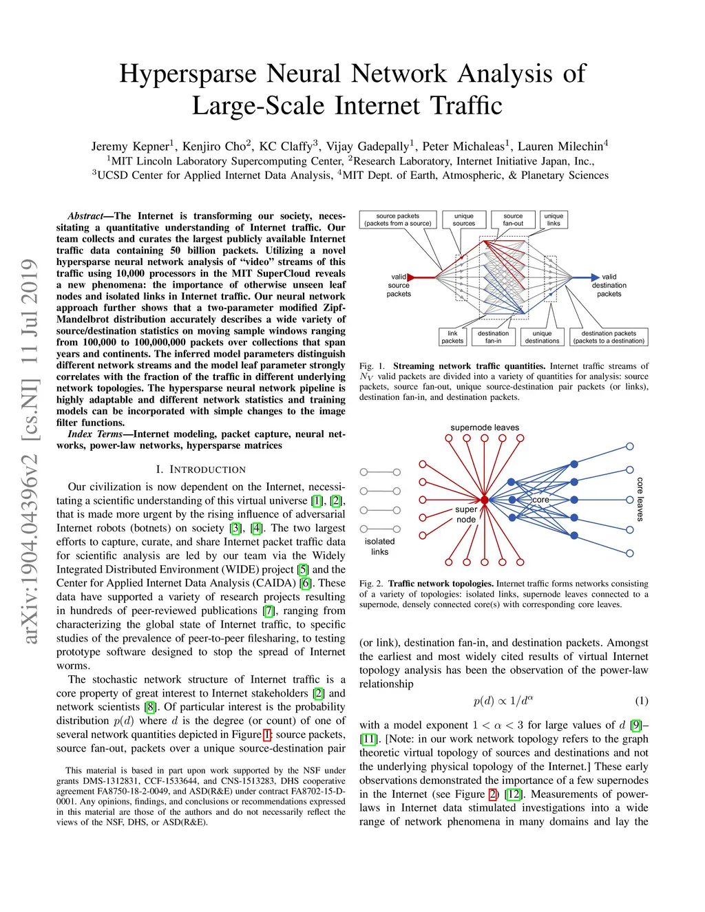 The Internet is transforming our society, necessitating a quantitative understanding of Internet traffic. Our team collects and curates the largest publicly available Internet traffic data containing 50 billion packets. Utilizing a novel hypersparse neural network analysis of "video" streams of this traffic using 10,000 processors in the MIT SuperCloud reveals a new phenomena: the importance of otherwise unseen leaf nodes and isolated links in Internet traffic. Our neural network approach further shows that a two-parameter modified Zipf-Mandelbrot distribution accurately describes a wide variety of source/destination statistics on moving sample windows ranging from 100,000 to 100,000,000 packets over collections that span years and continents. The inferred model parameters distinguish different network streams and the model leaf parameter strongly correlates with the fraction of the traffic in different underlying network topologies. The hypersparse neural network pipeline is highly adaptable and different network statistics and training models can be incorporated with simple changes to the image filter functions.