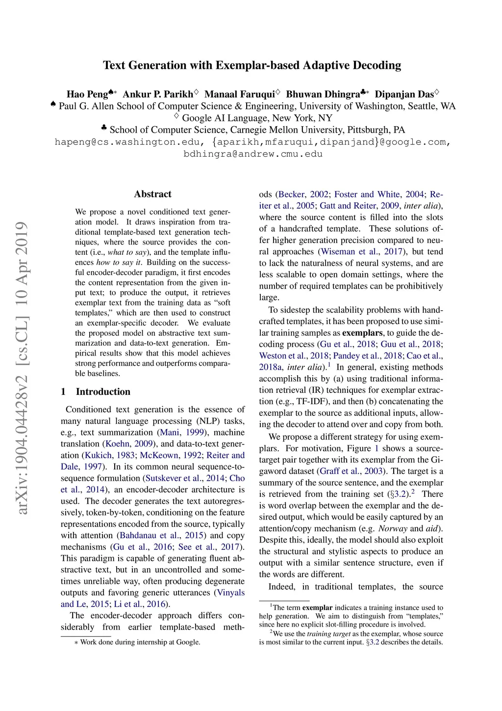 Text Generation with Exemplar-based Adaptive Decoding