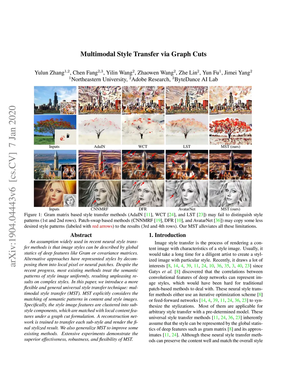 An assumption widely used in recent neural style transfer methods is that image styles can be described by global statics of deep features like Gram or covariance matrices. Alternative approaches have represented styles by decomposing them into local pixel or neural patches. Despite the recent progress, most existing methods treat the semantic patterns of style image uniformly, resulting unpleasing results on complex styles. In this paper, we introduce a more flexible and general universal style transfer technique: multimodal style transfer (MST). MST explicitly considers the matching of semantic patterns in content and style images. Specifically, the style image features are clustered into sub-style components, which are matched with local content features under a graph cut formulation. A reconstruction network is trained to transfer each sub-style and render the final stylized result. We also generalize MST to improve some existing methods. Extensive experiments demonstrate the superior effectiveness, robustness, and flexibility of MST.