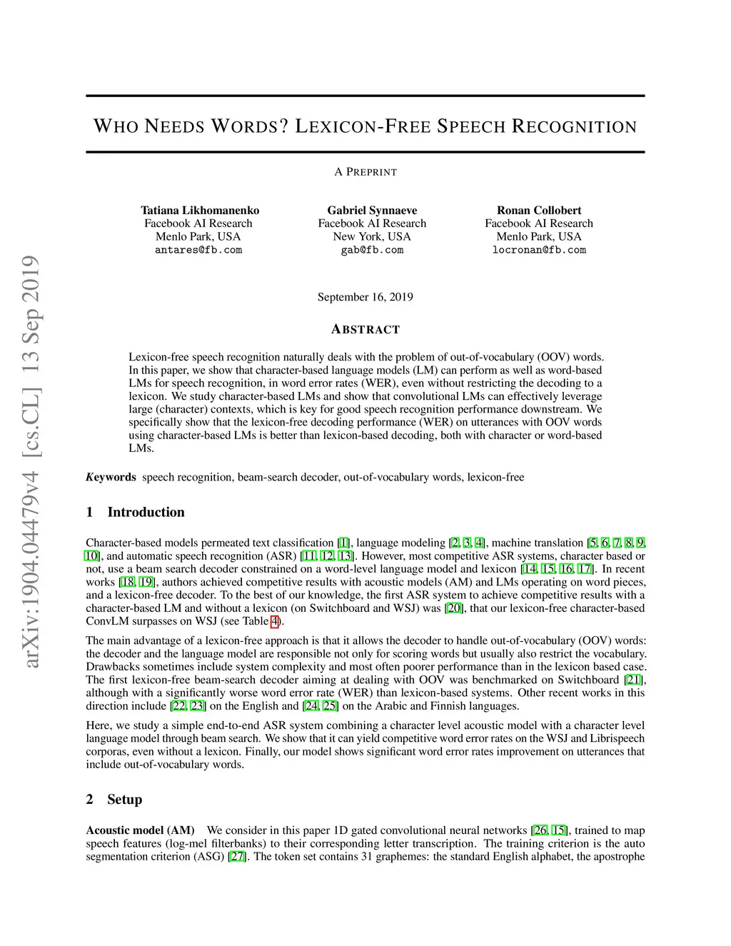 Lexicon-free speech recognition naturally deals with the problem of out-of-vocabulary (OOV) words. In this paper, we show that character-based language models (LM) can perform as well as word-based LMs for speech recognition, in word error rates (WER), even without restricting the decoding to a lexicon. We study character-based LMs and show that convolutional LMs can effectively leverage large (character) contexts, which is key for good speech recognition performance downstream. We specifically show that the lexicon-free decoding performance (WER) on utterances with OOV words using character-based LMs is better than lexicon-based decoding, both with character or word-based LMs.