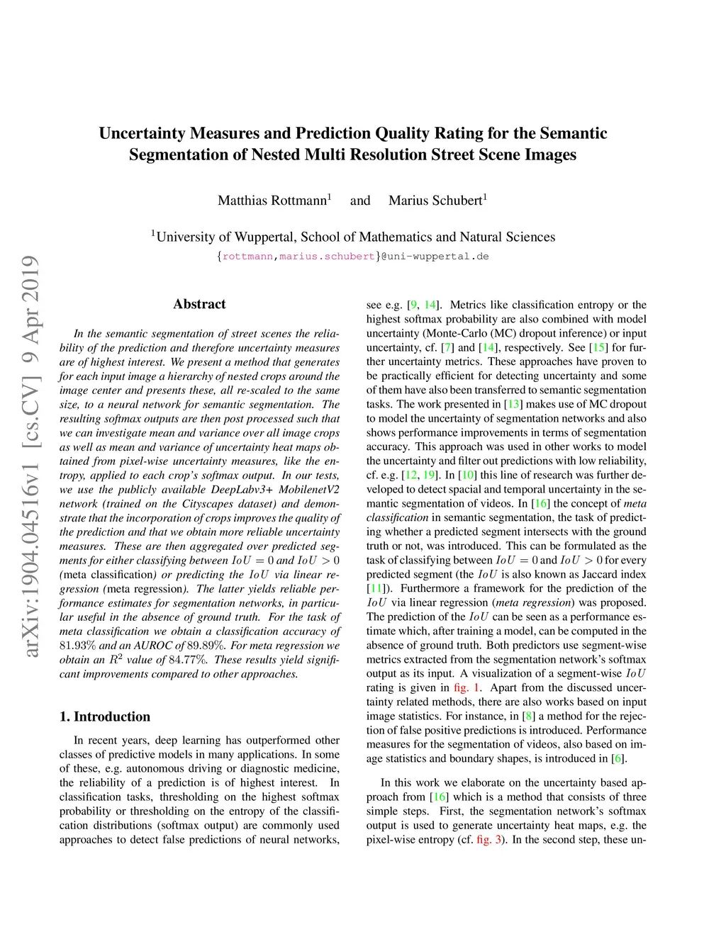In the semantic segmentation of street scenes the reliability of the prediction and therefore uncertainty measures are of highest interest. We present a method that generates for each input image a hierarchy of nested crops around the image center and presents these, all re-scaled to the same size, to a neural network for semantic segmentation. The resulting softmax outputs are then post processed such that we can investigate mean and variance over all image crops as well as mean and variance of uncertainty heat maps obtained from pixel-wise uncertainty measures, like the entropy, applied to each crop's softmax output. In our tests, we use the publicly available DeepLabv3+ MobilenetV2 network (trained on the Cityscapes dataset) and demonstrate that the incorporation of crops improves the quality of the prediction and that we obtain more reliable uncertainty measures. These are then aggregated over predicted segments for either classifying between IoU=0 and IoU>0 (meta classification) or predicting the IoU via linear regression (meta regression). The latter yields reliable performance estimates for segmentation networks, in particular useful in the absence of ground truth. For the task of meta classification we obtain a classification accuracy of and an AUROC of . For meta regression we obtain an value of . These results yield significant improvements compared to other approaches.