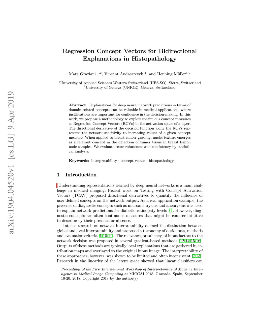 Explanations for deep neural network predictions in terms of domain-related concepts can be valuable in medical applications, where justifications are important for confidence in the decision-making. In this work, we propose a methodology to exploit continuous concept measures as Regression Concept Vectors (RCVs) in the activation space of a layer. The directional derivative of the decision function along the RCVs represents the network sensitivity to increasing values of a given concept measure. When applied to breast cancer grading, nuclei texture emerges as a relevant concept in the detection of tumor tissue in breast lymph node samples. We evaluate score robustness and consistency by statistical analysis.