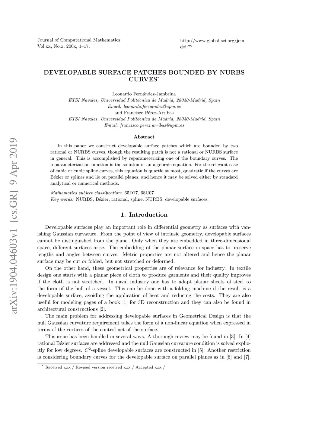 In this paper we construct developable surface patches which are bounded by two rational or NURBS curves, though the resulting patch is not a rational or NURBS surface in general. This is accomplished by reparameterizing one of the boundary curves. The reparameterization function is the solution of an algebraic equation. For the relevant case of cubic or cubic spline curves, this equation is quartic at most, quadratic if the curves are Bezier or splines and lie on parallel planes, and hence it may be solved either by standard analytical or numerical methods.