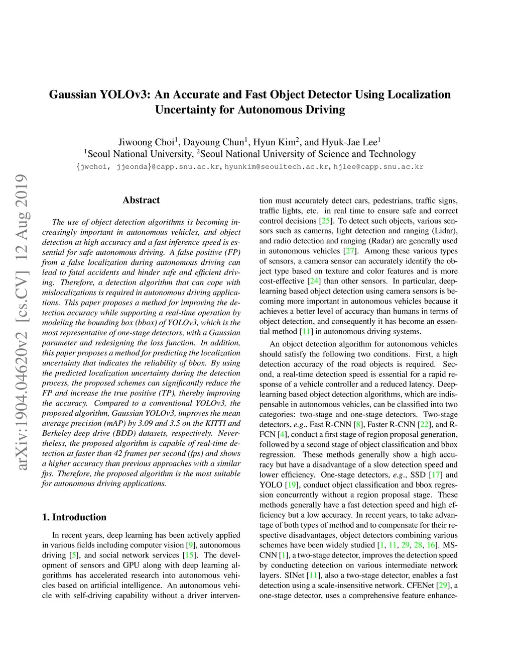 The use of object detection algorithms is becoming increasingly important in autonomous vehicles, and object detection at high accuracy and a fast inference speed is essential for safe autonomous driving. A false positive (FP) from a false localization during autonomous driving can lead to fatal accidents and hinder safe and efficient driving. Therefore, a detection algorithm that can cope with mislocalizations is required in autonomous driving applications. This paper proposes a method for improving the detection accuracy while supporting a real-time operation by modeling the bounding box (bbox) of YOLOv3, which is the most representative of one-stage detectors, with a Gaussian parameter and redesigning the loss function. In addition, this paper proposes a method for predicting the localization uncertainty that indicates the reliability of bbox. By using the predicted localization uncertainty during the detection process, the proposed schemes can significantly reduce the FP and increase the true positive (TP), thereby improving the accuracy. Compared to a conventional YOLOv3, the proposed algorithm, Gaussian YOLOv3, improves the mean average precision (mAP) by 3.09 and 3.5 on the KITTI and Berkeley deep drive (BDD) datasets, respectively. Nevertheless, the proposed algorithm is capable of real-time detection at faster than 42 frames per second (fps) and shows a higher accuracy than previous approaches with a similar fps. Therefore, the proposed algorithm is the most suitable for autonomous driving applications.